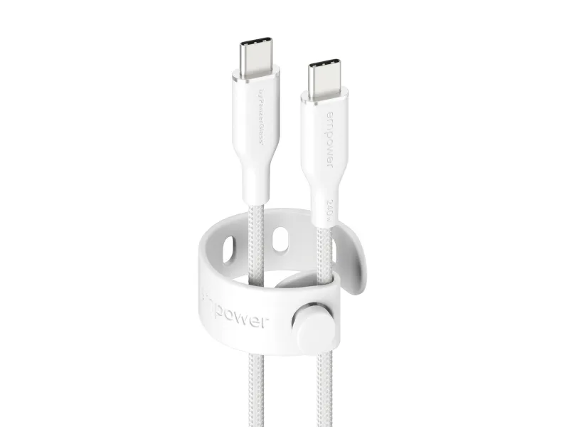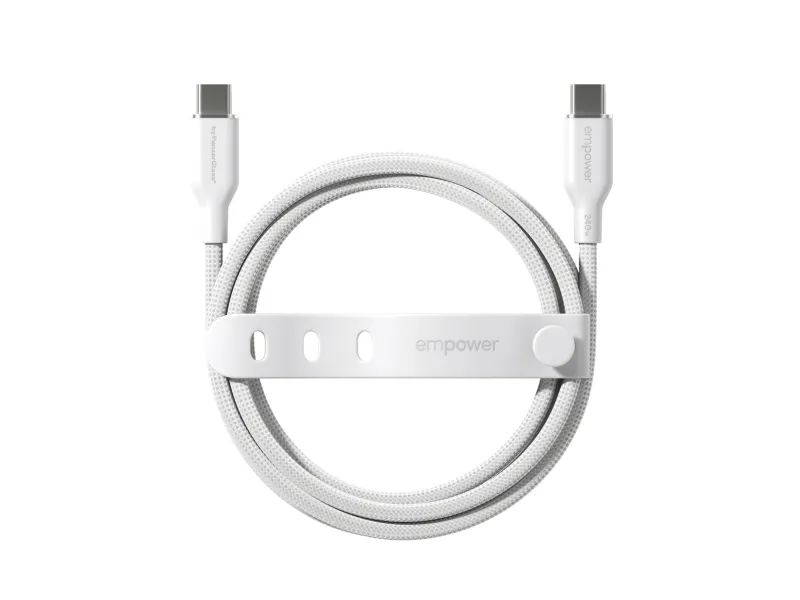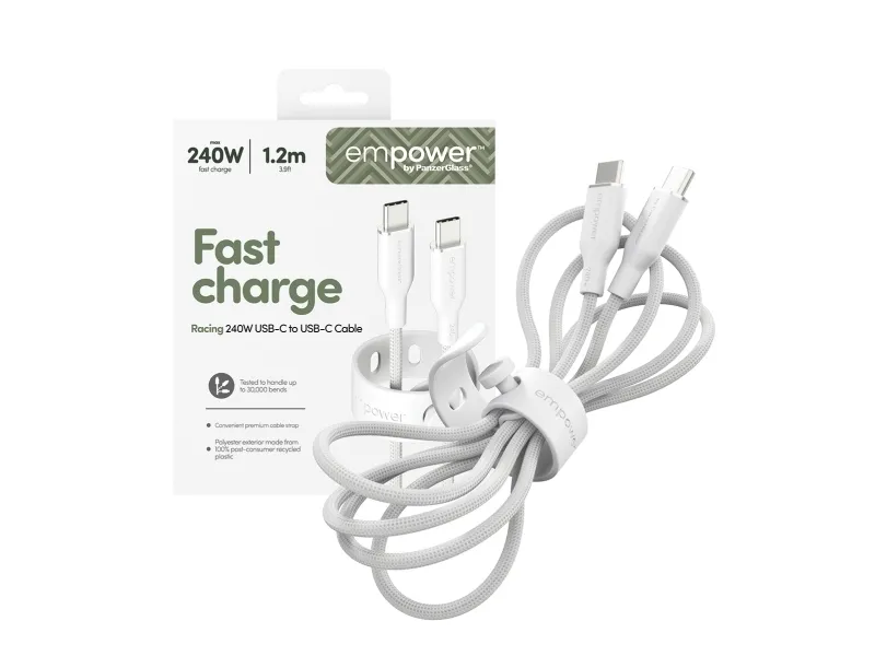 FAST CHARGEempower by PanzerGlass USB-C to USB-C Cable 240WReliable and durable charging cables for MacBook, iPhone, Samsung, AirPods, and other smartphones, laptops, tablets and devices supporting USB-C charging. So buckle in for high-speed charging!One cable for all your devices•    Supports fast charging up to 240W •    1.2 meters•    Tested to survive up to 30,000 bends•    Ultra-soft and tangle-free•    Convenient cable strap•    Made from 100% post consumer recycled materialsEnhanced durabilityIntroducing the empower by PanzerGlass Racing Cable Series – where reliability meets speed! This durable, heavy-duty braided cable boasts a 30,000-bend lifespan. Carefully designed to ensure durability and guarantee a long lifeNeed for speed! The empower by PanzerGlass Racing USB-C to USB-C Cable features an ultra-soft and strong silicon interior paired with a braided outer cable sheath for durability and a premium feel. Convenience is key. Keep the cable organized when not in use with a handy strap. And the best part? It's made from 100% post-consumer recycled (PCR) materials.The faster charging means you'll spend less time waiting and more time doing what you love.Hello, we're empower by PanzerGlass  We make extraordinary accessories that empower people to connect with friends, family, colleagues and technology every day.