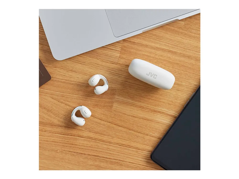 The JVC HA NP1T true wireless earphones offer a seamless audio experience for portable electronics. With Bluetooth 5.3 connectivity, it ensures stable wireless performance and supports multipoint pairing, allowing you to connect to multiple devices. The earphones feature an open ear design with a comfortable clip-on mount, ideal for extended listening sessions while on the go. With a frequency response range of 20 - 20,000 Hz and built on neodymium magnets, these earphones deliver rich sound quality in a lightweight format.