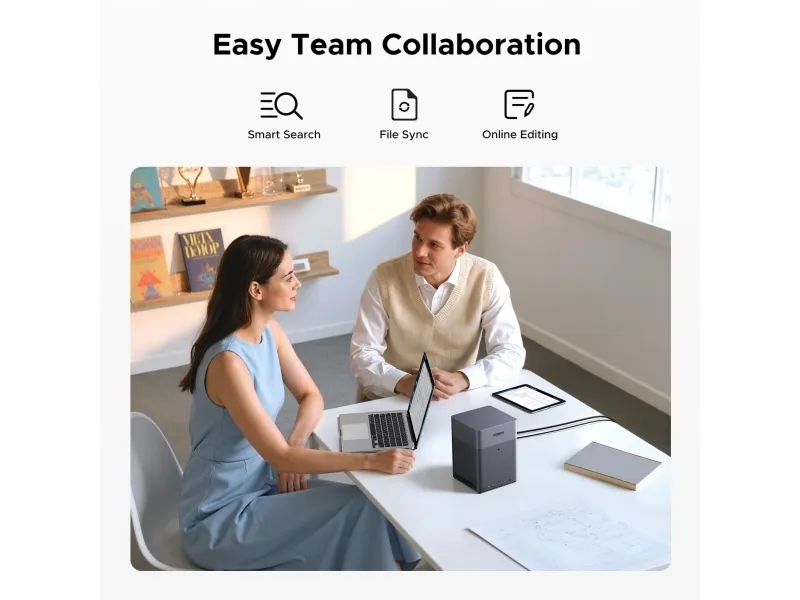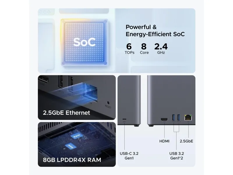 Connectivity is made easy with multiple interfaces including 2.5 Gigabit Ethernet, HDMI output, and USB-C ports. The hot-swap expansion bays accommodate both 2.5"