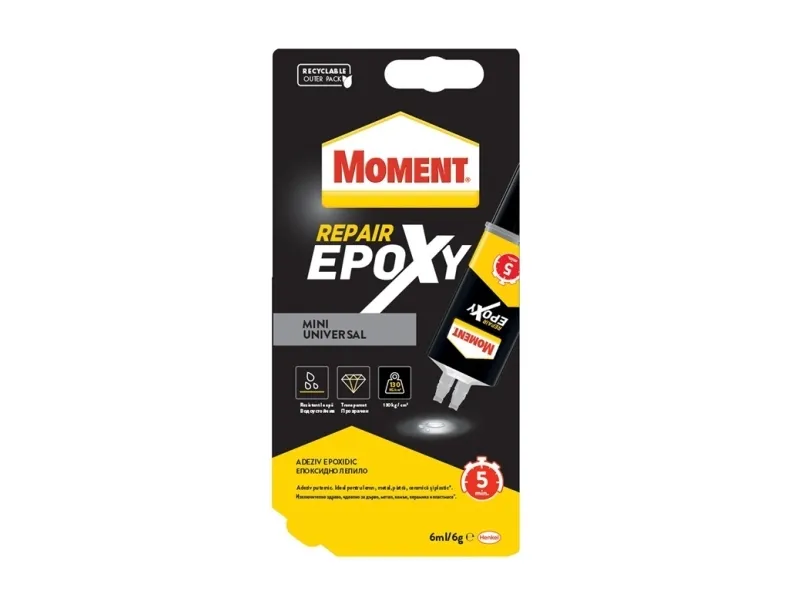 Brand- Moment. Areas of adhesive application- , Metal, Glass, Plastic, Wood, , , Ceramics, . Glue colour- Clear. Volume- 0.006 l. Store at temperature- 10 - 30°C. Completely dry after- 24 - 24h. Can be painted- Yes. Water resistance- Yes.