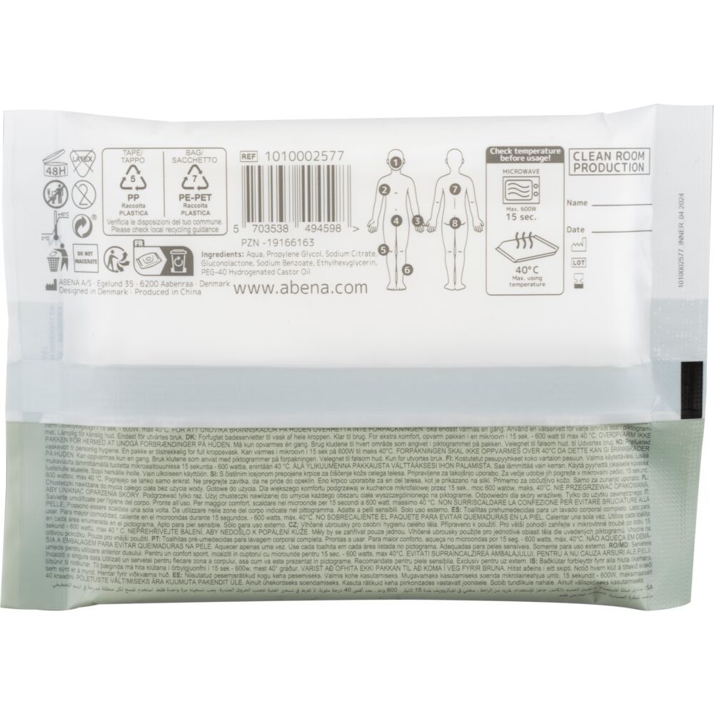 ABENAs Sengebadsservietter er forfugtede servietter designet til en behagelig og effektiv kropsvask. Vores servietter bruges typisk, når et traditionelt bad ikke er en mulighed eller til personer med forflytningsbesvær. Ældre hud kræver ofte en mere skånsom pleje. ABENAs Sengebadsservietter har en skånsom formular og med fugtgivende ingredienser, som renser huden skånsomt uden at forårsage irritation eller tørhed. ABENAs Sengebadsservietter kommer i små pakker og er klar til brug. Det resulterer i en meget praktisk løsning for plejepersonale eller familiemedlemmer, som hjælper immobile mennesker med personlig hygiejne. Servietpakken kommer i lommestørrelse, som gør den nem og diskret at have med i en lomme eller taske. På trods af den lille størrelse er badeservietterne i én pakke ofte designet til rensning af hele kroppen. Dette gør dem meget hygiejniske, da én pakke kan række til en hel kropsvask, hvilket minimerer risikoen for krydskontaminering, i for eksempel hospitaler og plejehjem. For en øget komfort kan den uåbnede pakke også opvarmes i mikroovnen.