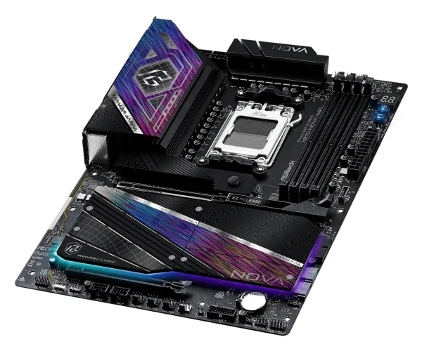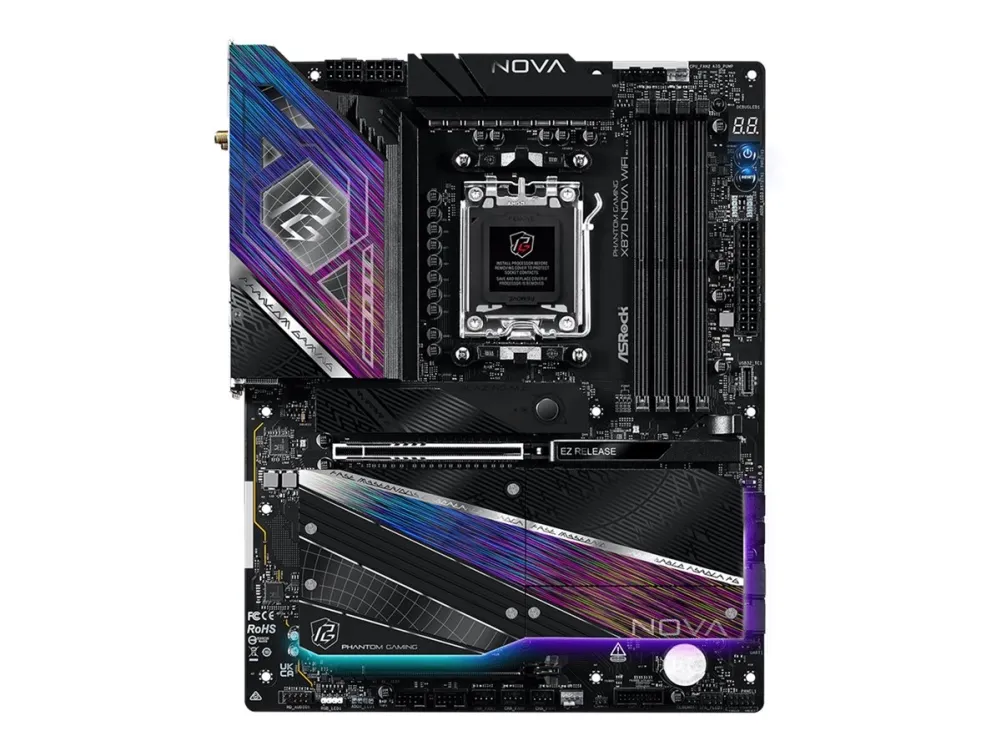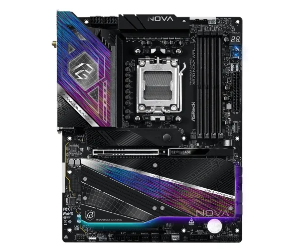The ASRock Phantom Gaming X870 NOVA WiFi motherboard is engineered for high-performance computing, supporting AMD Ryzen 7000, 8000, and 9000 series processors. This ATX mainboard features a robust AMD X870 chipset and is designed to handle DDR5 SDRAM with speeds up to 8400 MT/s when overclocked. Equipped with four DIMM slots, it allows for dual-channel memory architecture, ensuring performance in demanding applications.