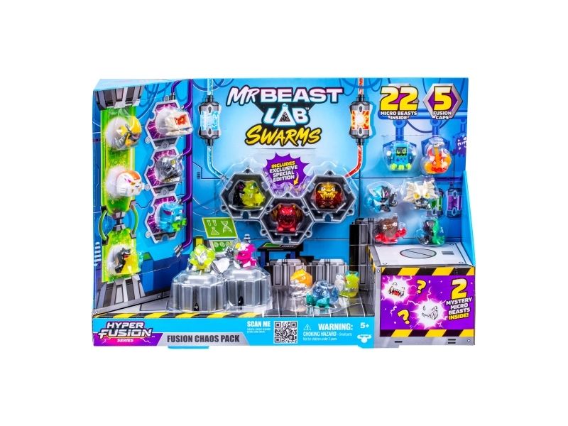 Öppna MrBeast Lab Fusions-kaos och den mystiska boxen! Avslöja 21 coola Hyper Fusion Swarms-figurer + 1 limited edition-figur och 5 figurställ. Får du kanske flera sällsynta? Över 100 Mikro Swarms-figurer att samla på. Från 5 år.