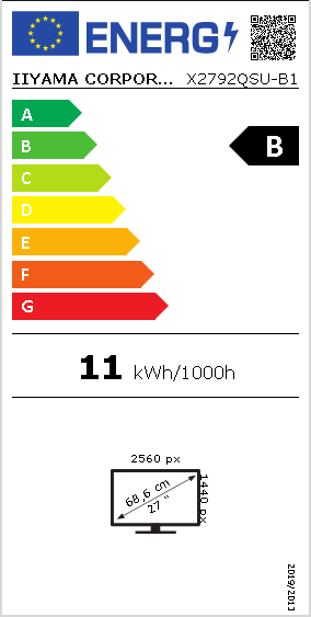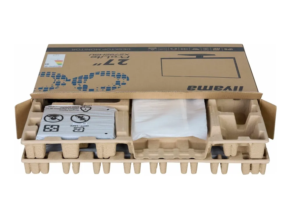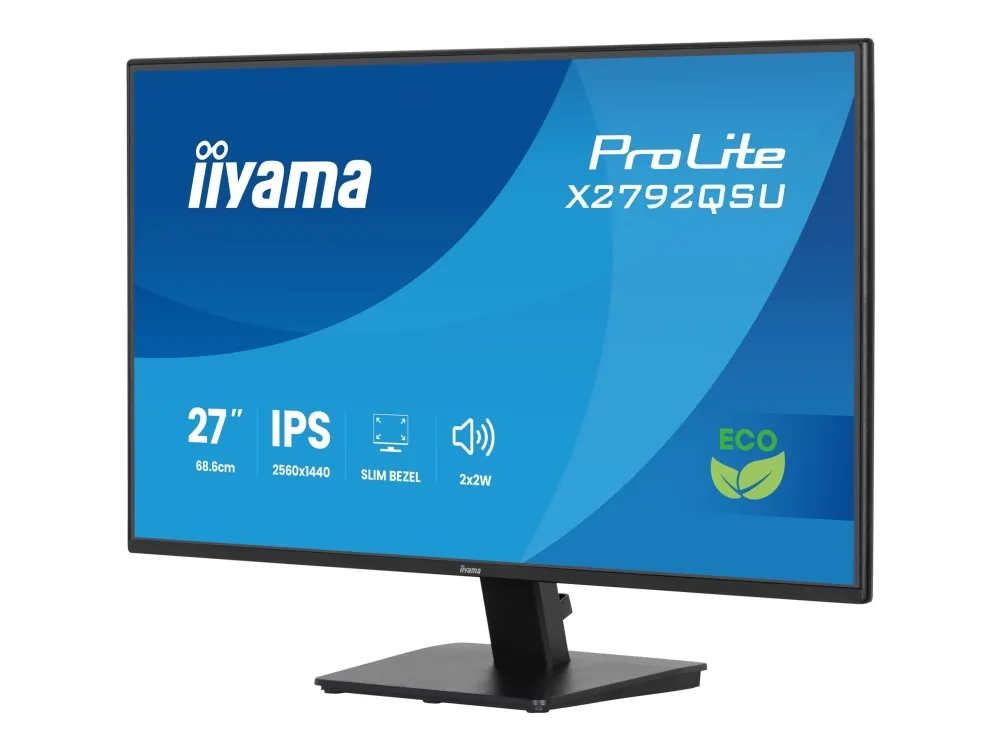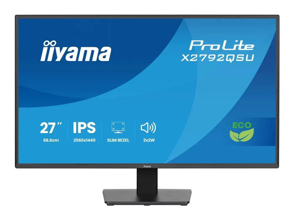 The ProLite X2792QSU is a 27'' QHD monitor ideal for professionals who need more screen space, precise image quality, and a sustainable choice. Packaged without plastic and made from 85% post-consumer recycled materials, it meets TCO Certification and EPEAT® Silver standards. With a resolution of 2560 x1440, it offers 77% more screen space than Full HD, helping you work across multiple windows and view more detail without constant scrolling. Its IPS panel delivers sharp detail, vibrant colours and wide viewing angles, while the frameless design creates a sleek, distraction‑free workspace. To take care of your eye health, it complies with the Eye Safe and Eye Comfort Certifications.iiyama ProLite X2792QSU-B1. Display diagonal: 68.6 cm (27"), Display resolution: 2560 x 1440 pixels, HD type: Quad HD, Display technology: LED, Display surface: Matt, Response time: 3 ms, Native aspect ratio: 16:9, Viewing angle, horizontal: 178°, Viewing angle, vertical: 178°. Built-in speaker(s). Built-in USB hub, USB hub version: 3.2 Gen 1 (3.1 Gen 1). VESA mounting. Product colour: Black