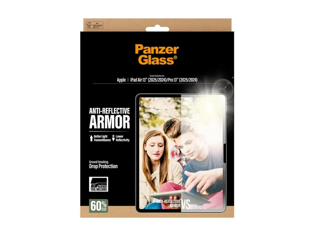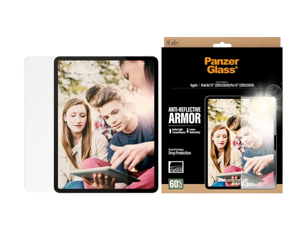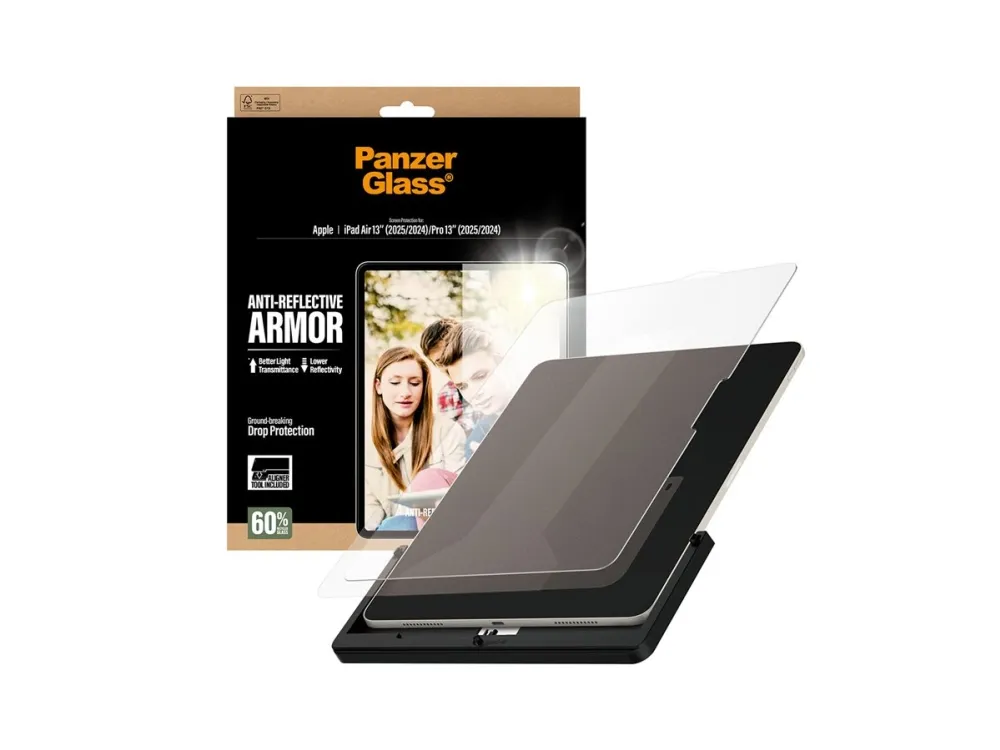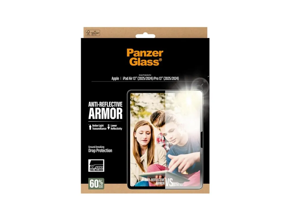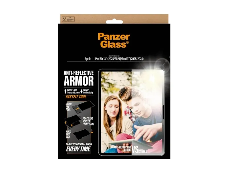 When it comes to your iPad, you want protection and optimal screen readability. The Anti-Reflective Armor Screen Protector from PanzerGlass delivers both. Made with 60% recycled glass, it protects your screen from everyday accidents. The new anti-reflective treatment significantly decreases reflections while increasing the light transmitted. That means you can view your screen in full sunlight with barely a hint of reflection. The texture provides a soft look, anti-glare properties and very low friction. Not to mention light transmission of more than 94% and reflectivity below 0.3%. Installation is a breeze with the new FastFit tool . Say goodbye to misalignment and dust intrusion. Simply place your iPad face-up, pull the tab, and enjoy the flawless installation. For extra protection, pair the Anti-Reflective Armor Screen Protector with PanzerGlass PicturePerfect or Hoops camera lens protectors and a CARE by PanzerGlass case.