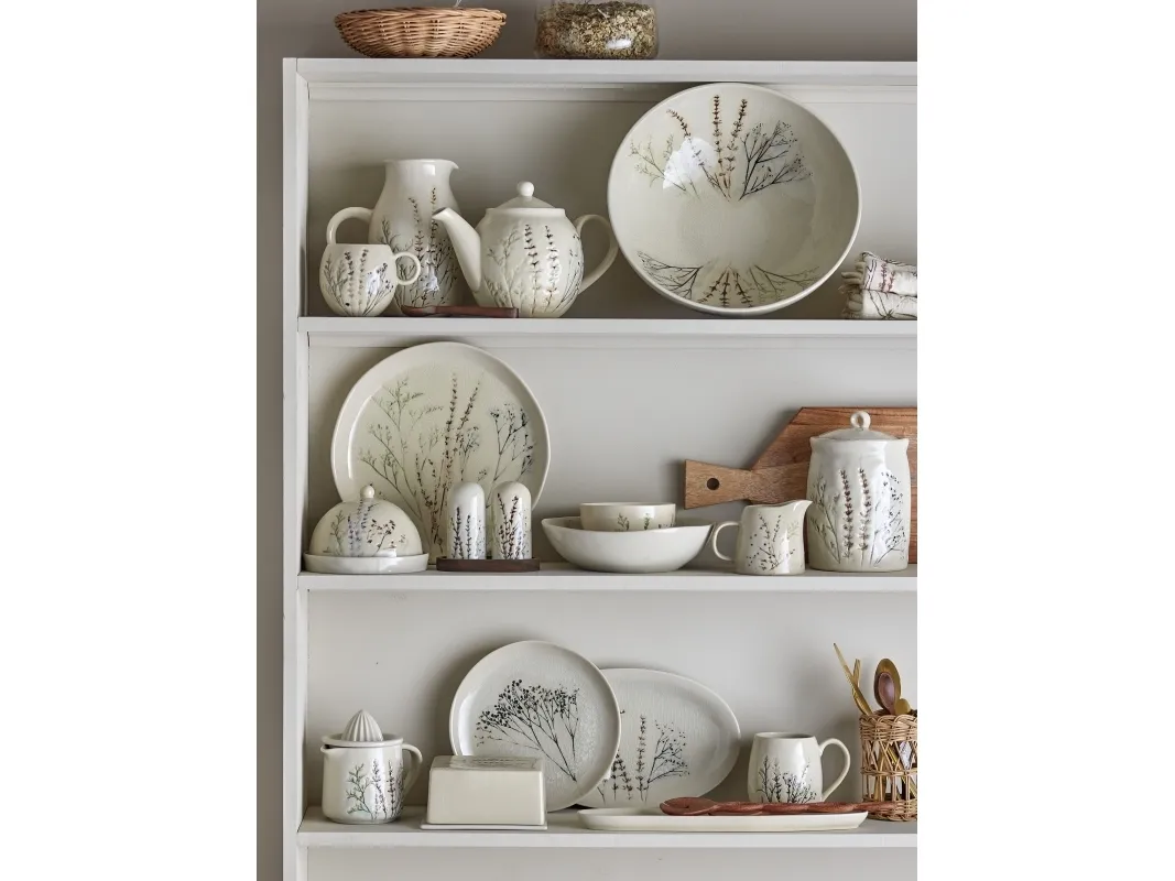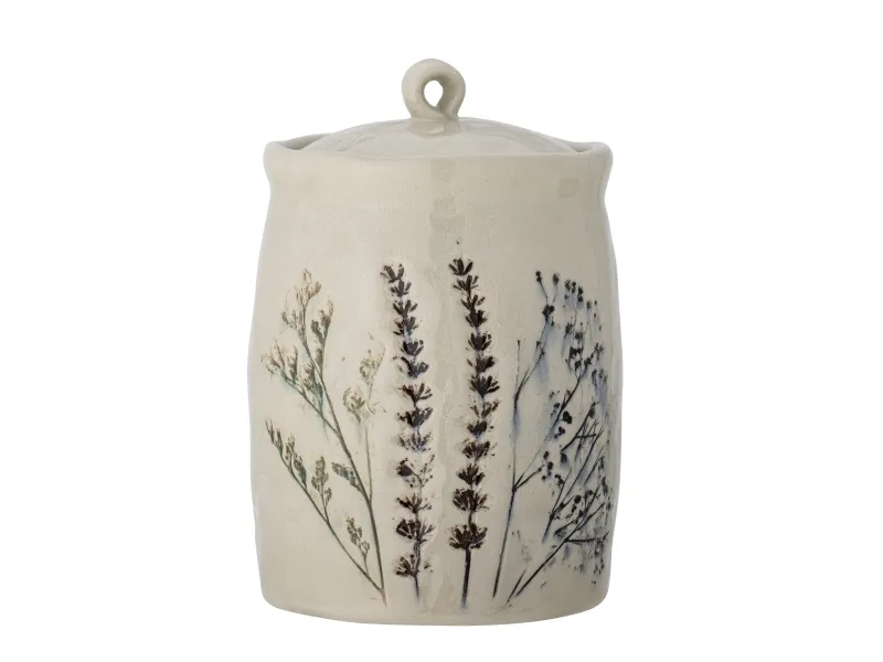 Bea Krukken m/låg fra Bloomingville er en praktisk krukke af stentøj, prydet med et delikat, håndmalet blomstermotiv på dens krakelerede glasur. De håndmalede detaljer sikrer, at hver krukke er unik.