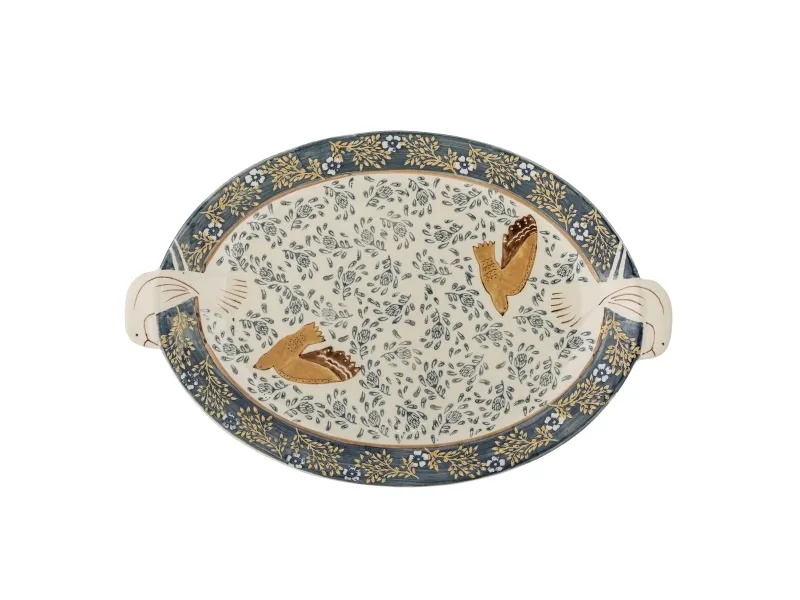 Hezha Serveringsbakken fra Bloomingville er et smukt, hånddekoreret fad, der imponerer med sine mange detaljer. Det har et indgraveret design kombineret med et flot printet mønster af fugle i varme farver. Fadet er perfekt til servering eller som en dekorativ genstand i hjemmet.