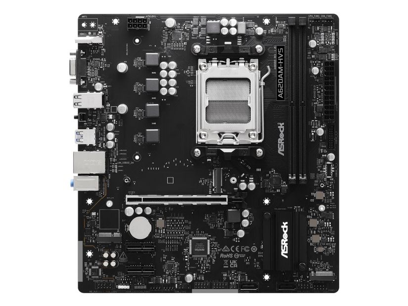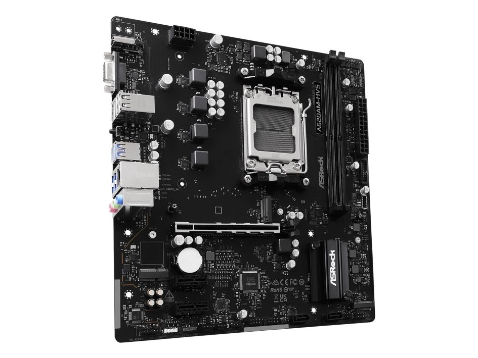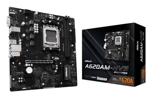 ASRock A620AM-HVS - Moderkort - micro ATX - Socket AM5 - AMD A620A Chipuppsättning - USB 3.2 Gen 1, USB-C 3.2 Gen 1 - Gigabit LAN - inbyggda grafiken (CPU krävs) - HD-ljud (8 kanaler)
