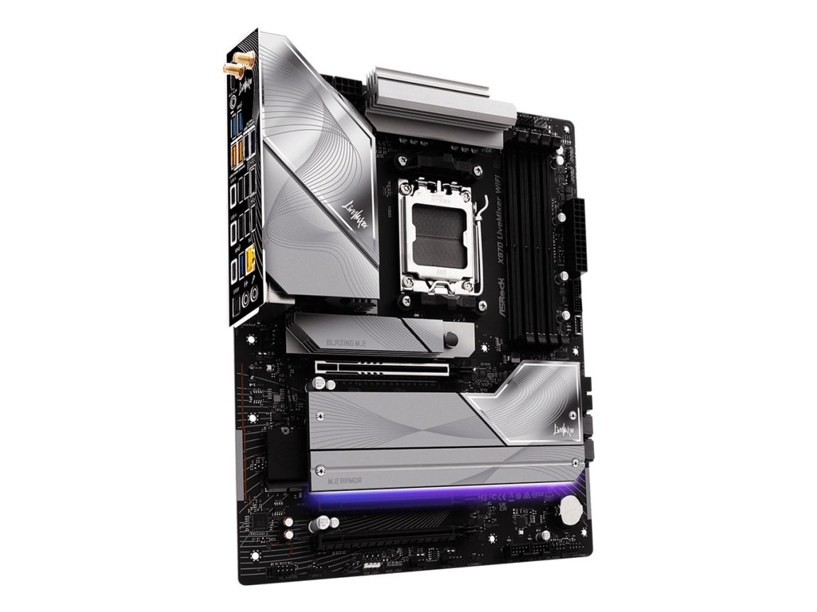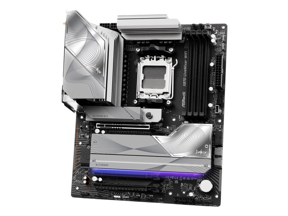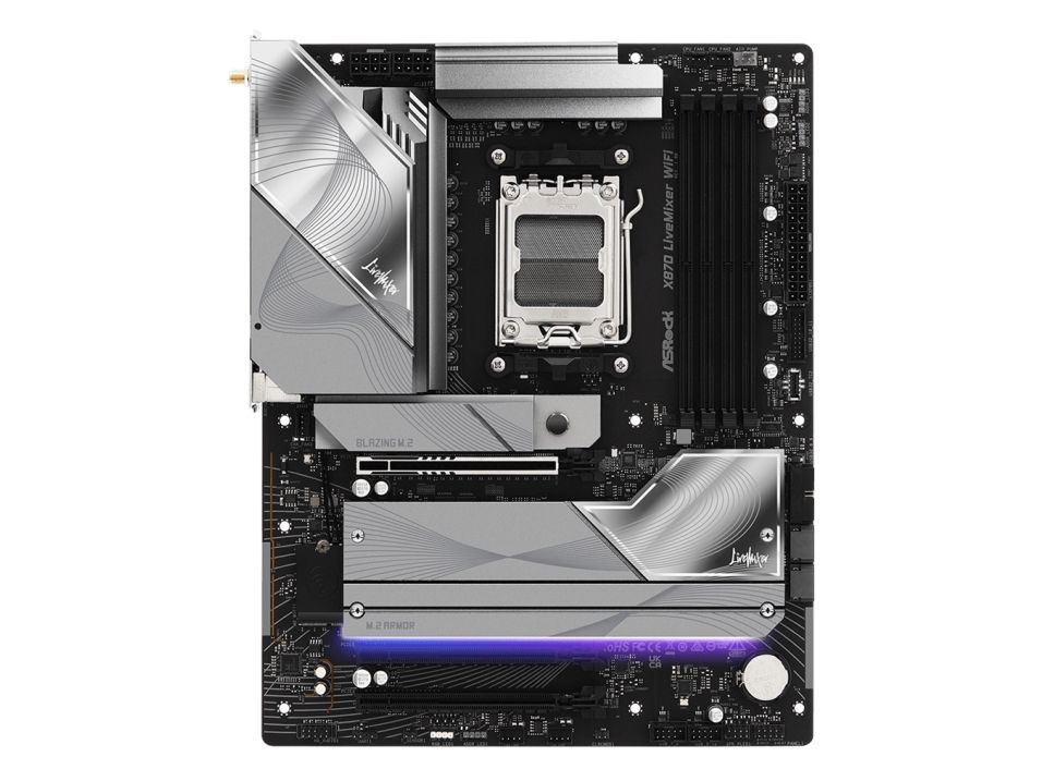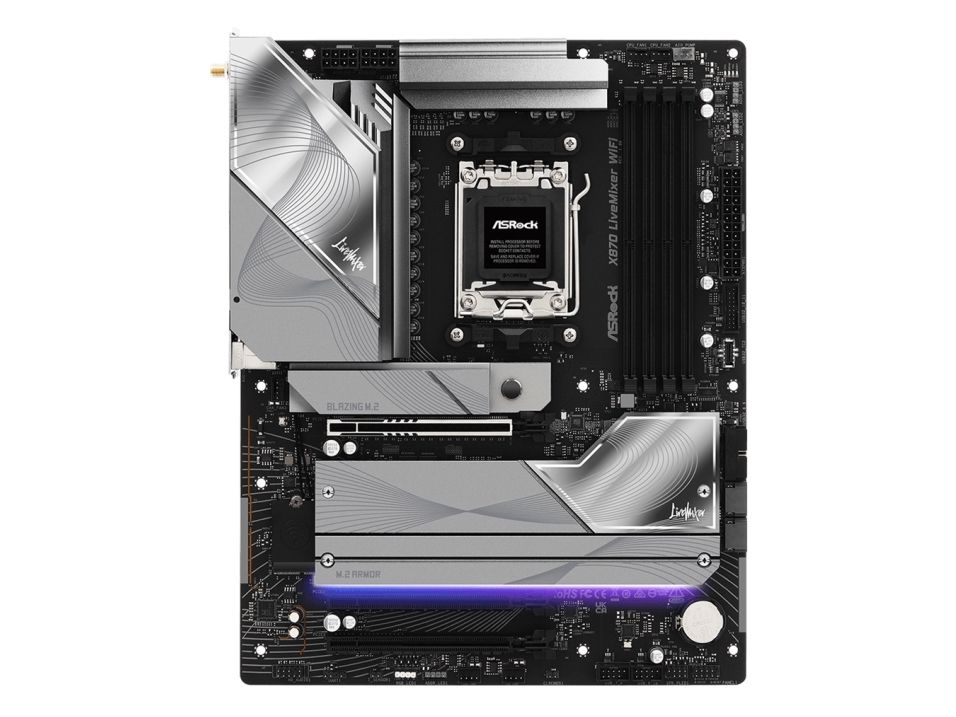 The ASRock X870 LIVEMIXER WIFI motherboard delivers a platform for building a high-performance system. Featuring support for the AMD Ryzen 7000/8000/9000 Series processors and equipped with a Socket AM5, this motherboard is designed for gamers and content creators seeking efficiency and versatility. The 4 DIMM slots enable dual-channel memory architecture, accommodating DDR5 SDRAM with speeds up to 8000 MT/s (O.C.). Enhanced with high-definition audio technology and a Realtek ALC4082 codec, it ensures immersive sound quality for both gaming and multimedia applications. Connectivity is abundant with multiple USB ports including USB 4, USB-C, and traditional USB connections, making it easy to connect peripherals and external devices. Equipped with Wi-Fi 6 and Bluetooth 5.4 capabilities, this motherboard ensures fast and reliable networking options. The board's design features a DIY-friendly layout and includes essential hardware improvements like a pre-mounted I/O shield and an enlarged heatsink armor for optimal thermal performance. For users who demand versatility, the ASRock X870 LIVEMIXER WIFI provides multiple expansion slots for graphics and storage options including Blazing M.2 and Hyper M.2 sockets. This combination of features and technology makes it a choice for building a future-ready PC.