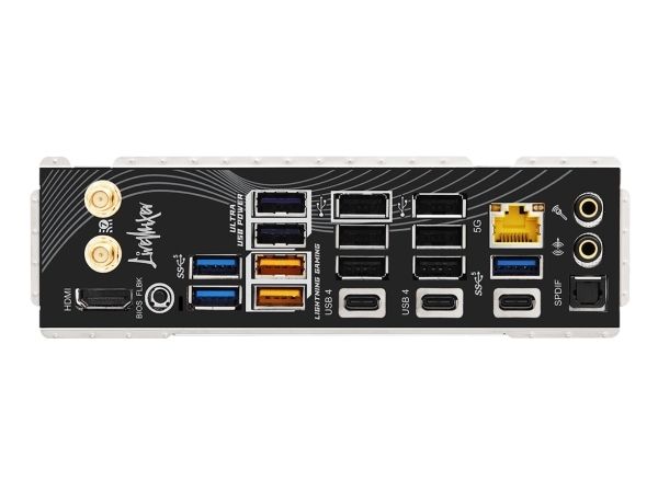 2 x antenn 1 x HDMI 2 x USB4 1 x USB-C 3.2 Gen 1 7 x USB 3.2 Gen 1 6 x USB 2.0 1 x LAN (5Gigabit Ethernet) 1 x mikrofon - mini-jack 1 x ljudutgång - mini-jack 1 x SPDIF-utgång