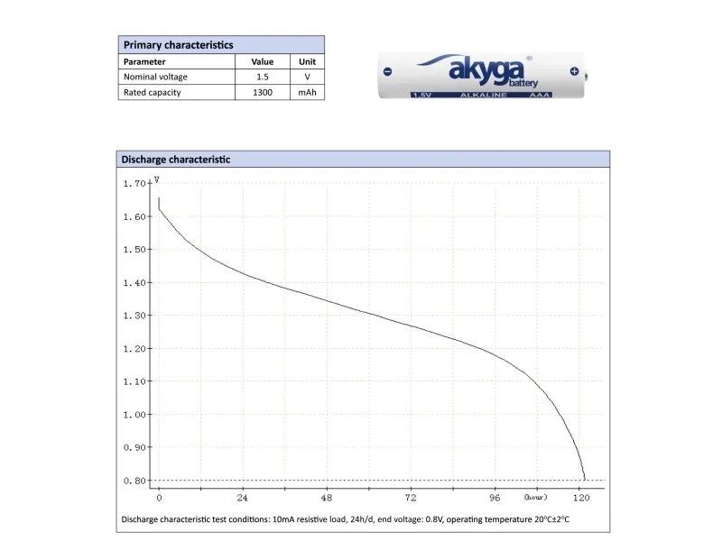 The Akyga AKY2057 battery is designed for reliable performance with a voltage of 1.5 V. This alkaline battery features a capacity of 1300 mAh, making it suitable for a variety of devices. The AAA / LR03 form factor ensures compatibility with numerous household and portable electronics, providing a practical power solution.