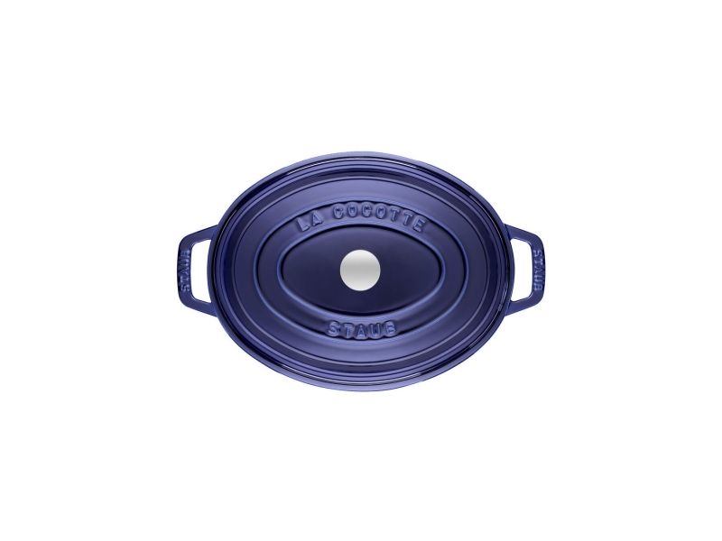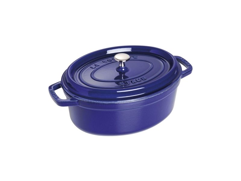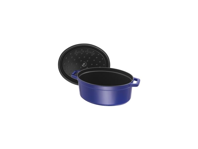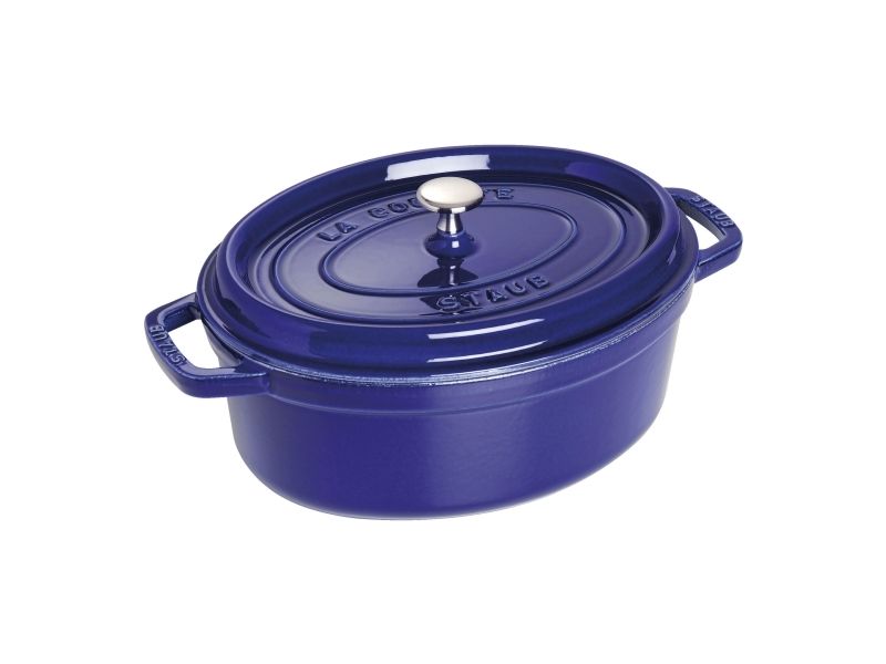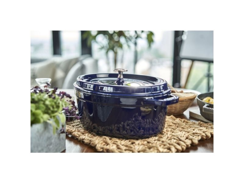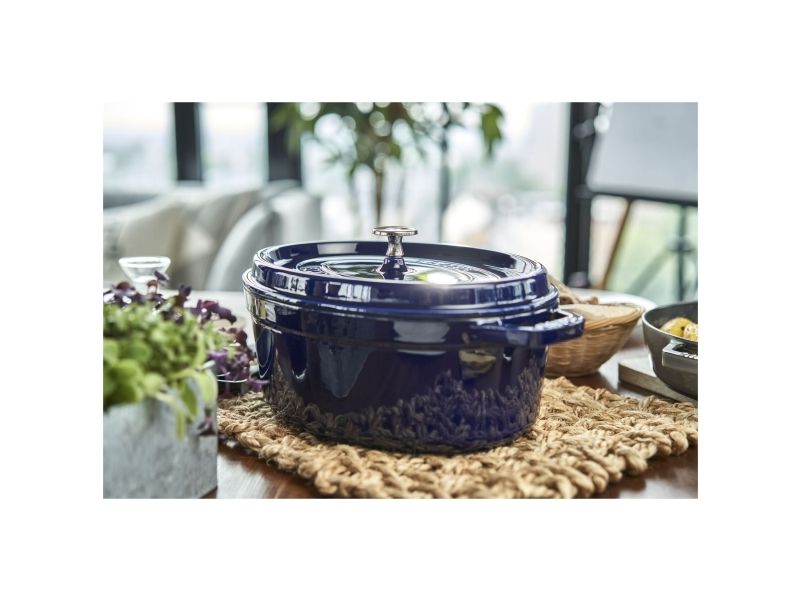 In the oval Staub cocotte you can make delicious stews of all kinds, such as hearty goulashes or French specialities, for example. These type of pots were specifically developed in France for slowly casseroling food. They allow the flavors to develop fully and so intensify the taste of ingredients. The cooking pot is made of cast iron, which ensures particularly uniform heat distribution and retention. It is also enameled inside, which reinforces the excellent stewing properties of cast iron. This enamel is matt black in color and is a pleasant contrast to the graphite gray pattern on the outside. So you can use the cocotte to serve at the table. It has several advantages: As well as looking good, food remains hot for a long time. The cocotte is suitable for any kind of hob, including induction cookers. You can also use it in the oven for recipes with longer cooking times.