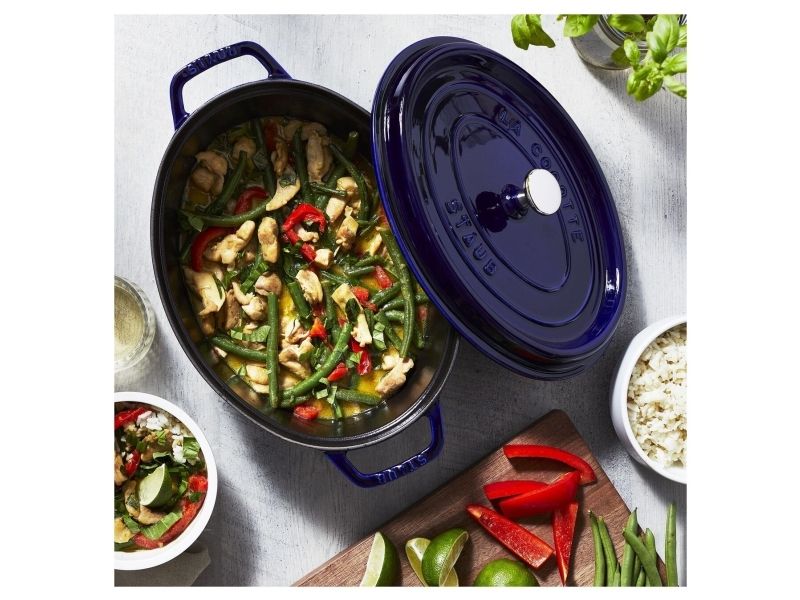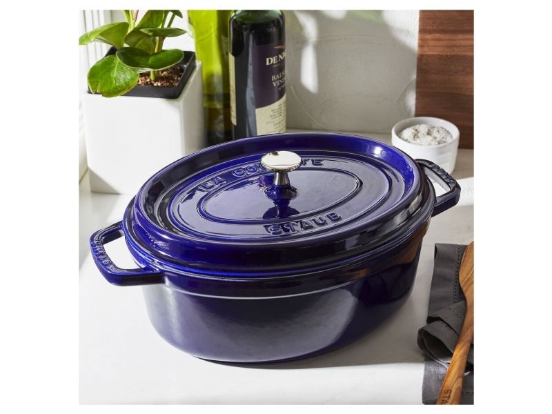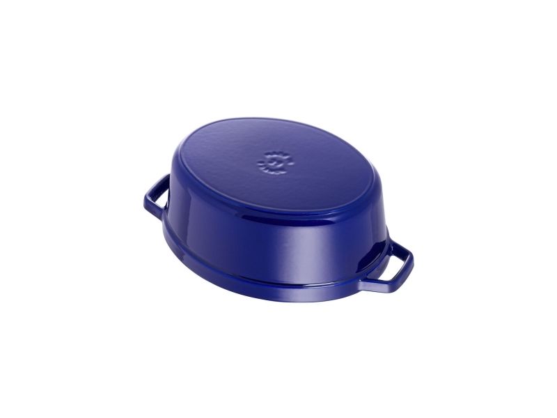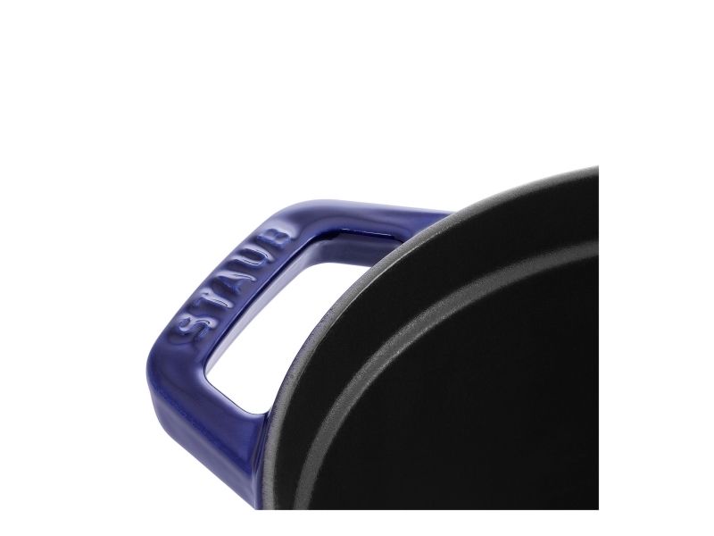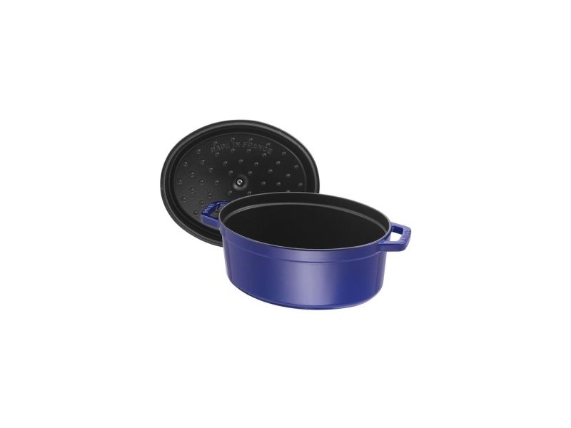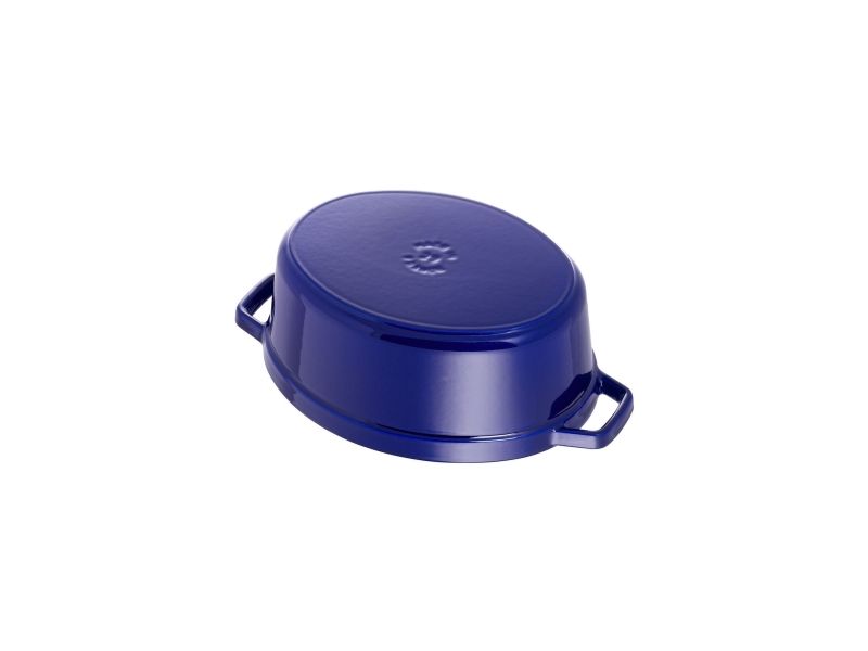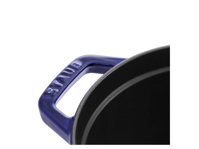 In the oval Staub cocotte you can make delicious stews of all kinds, such as hearty goulashes or French specialities, for example. These type of pots were specifically developed in France for slowly casseroling food. They allow the flavors to develop fully and so intensify the taste of ingredients. The cooking pot is made of cast iron, which ensures particularly uniform heat distribution and retention. It is also enameled inside, which reinforces the excellent stewing properties of cast iron. This enamel is matt black in color and is a pleasant contrast to the graphite gray pattern on the outside. So you can use the cocotte to serve at the table. It has several advantages: As well as looking good, food remains hot for a long time. The cocotte is suitable for any kind of hob, including induction cookers. You can also use it in the oven for recipes with longer cooking times.