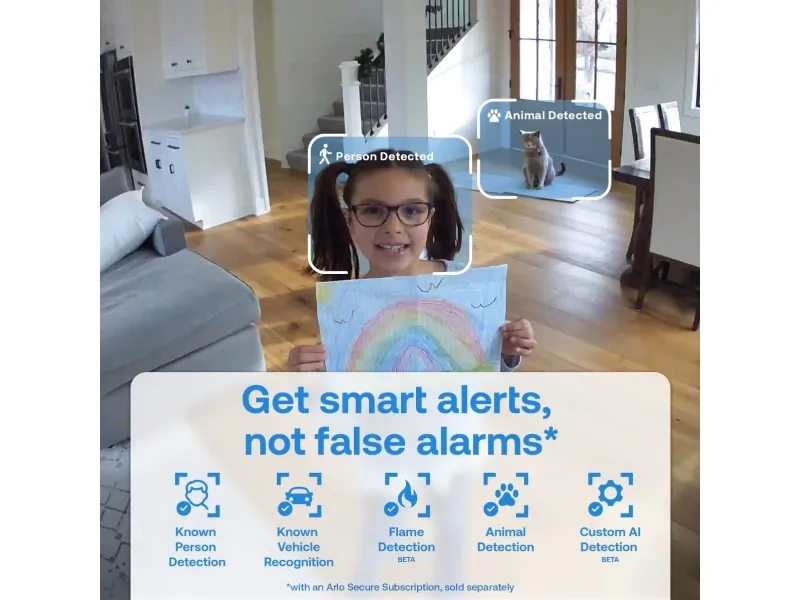 Echo cancelation, noise reduction, inbyggd siren, RGB status-LED, sekretesslutare, säkerhetskopiering i molnet, Person Detection, detektering av djur, Vehicle Detection, package detection, brandskydd med tidig varning