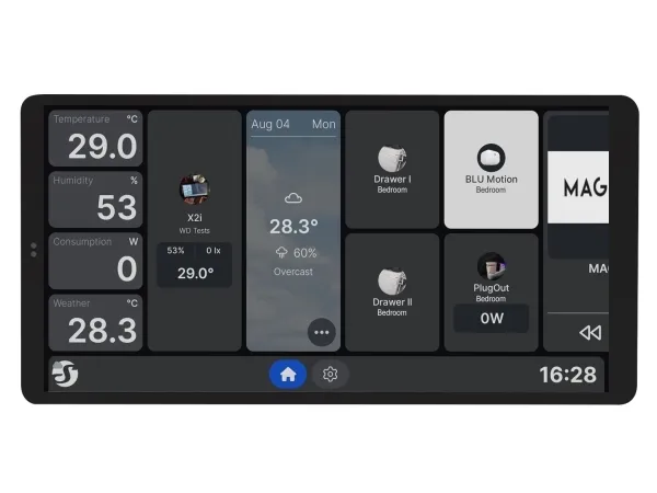 The Shelly Wall Display X2i is an advanced 6.9 touchscreen designed for professional control of smart home and building installations. It provides direct control of lighting, heating, shading, and Sonos/Bluetooth speakers. As the successor to the Wall Display X2, it is available with a silver (aluminium) or black frame. The unit fits a standard European wall box (horizontal or vertical) and requires only 230 V, but it can also be powered via USB-C when surface-mounted. The X2i includes an interchangeable base with a built-in 5 A relay for controlling lighting or underfloor heating. Optional bases with a dual relay or dimmer module are available. Once connected to Wi-Fi, the device provides full access to all Shelly devices and can display a Home Assistant dashboard for third-party integrations. The X2i features a built-in thermostat function and can control underfloor heating using an external temperature sensor. Key features: 6.9 touchscreen with intuitive interface, Fits standard EU wall boxes; 230 V or USB-C power supply, 2.4 GHz Wi-Fi, Interchangeable base with 5 A relay (optional dual relay or dimmer), Integrated light sensor, Built-in thermostat function (requires external temperature sensor), Real-time energy monitoring, Control of Bluetooth and Sonos speakers, 0.8 W speaker for radio and alarms, Bluetooth gateway for Shelly BLU devices