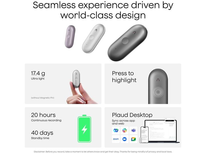 • Sömlös molnintegration och åtkomst via den kostnadsfria PLAUD-appen samt PLAUD Web och PLAUD Desktop