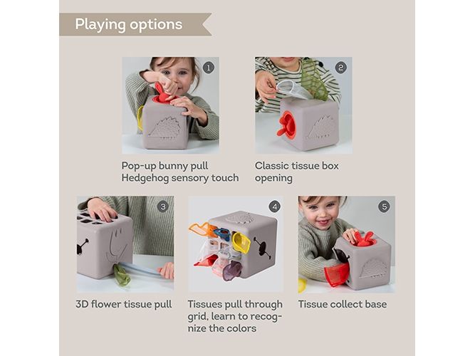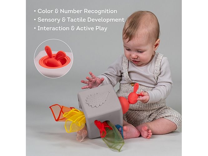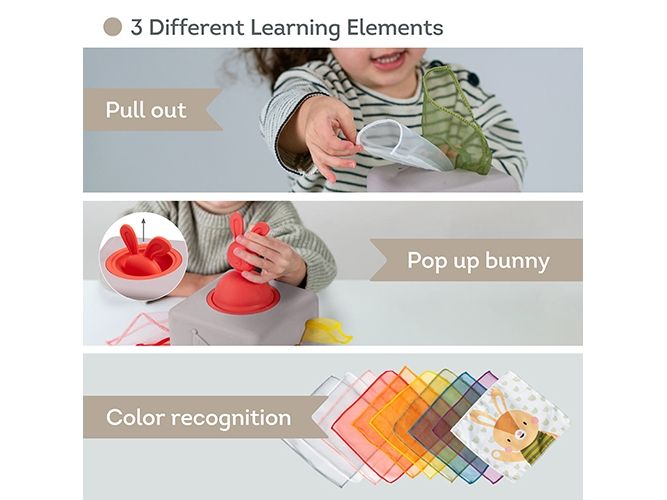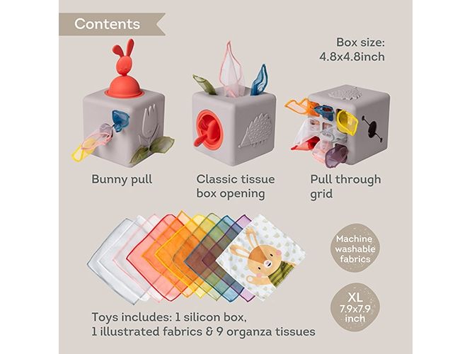 Designed with Montessori principles in mind, our Baby Tissue Box toy for babies is more than just fun – it's a developmental tool that enhances sensory-motor integration as little hands grasp, pull, and explore. The box's multiple sides include a fabric collection base to tidy up after play, ensuring that the fun is not only engaging but also organized. This sensory silicone toy is perfect for your baby's Easter basket or as a thoughtful gift for any occasion. Watch your baby's eyes light up with the pop-up soft bunny and enjoy moments of joyful discovery together. Choose the Baby Tissue Box with 10-piece Fabric Tissues and Sensory Silicone Toys for a magical addition to your baby's toy collection.