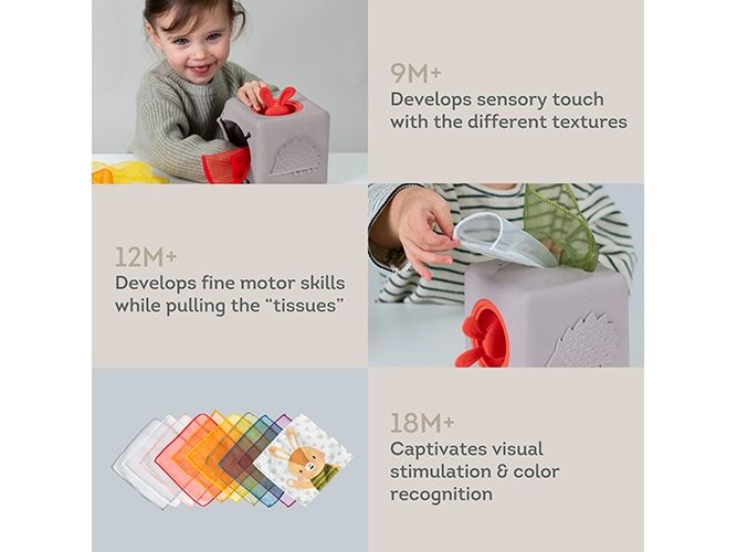 Introducing the enchanting Baby Tissue Box, a delightful 10-piece fabric tissue set designed to captivate and educate your little one. This innovative toy features a colorful pop-up tissue box that offers endless hours of interactive play. With 10 different fabrics including 8 shimmering organza tissues and 2 ultra-soft peach fabrics, babies from 6-12 months can experience a variety of textures that stimulate their tactile senses. Each side of the box presents a unique function; from the peek-a-boo bunny that encourages curious play, to the sensory hedgehog design for touch exploration, and a clever pull-through grid to develop motor skills. The Baby Tissue Box is not just a toy, it's a sensory adventure that grows with your child.