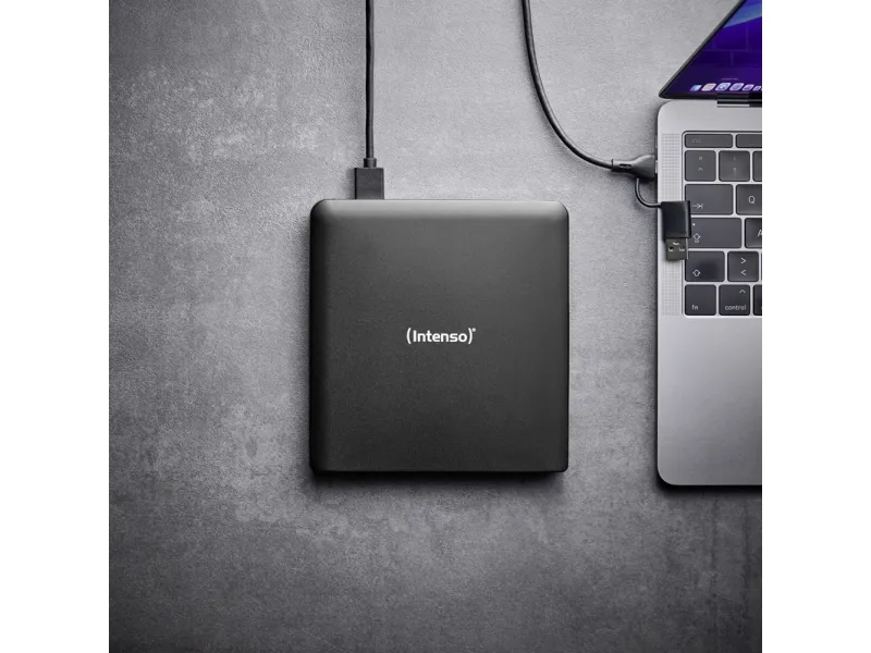 Versatile Blu-ray burner for the highest demands. For movies, data or music. The Intenso EOD 500BD Slim is the perfect companion for anyone who wants to securely store or play back data, movies, or music. This external Blu-ray burner reads and writes Blu-ray, DVD, and CD media at high speeds while supporting a wide range of formats. Thanks to its compact aluminum housing and easy USB connection, it is ideal for flexible use at home or on the go.