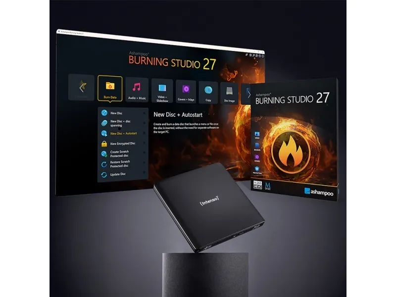 Fully equipped. User-friendly. The package includes a Y-cable (Micro-B to USB-C and USB-A) as well as the full version of Ashampoo Burning Studio software for easy data backup, media creation, and archiving. Its slim design (142 × 148 × 16 mm) and lightweight build of only 250 g make the EOD 500BD Slim especially portable. With modern technology and a durable aluminum case, it’s the perfect solution for professional data storage and high-quality media playback.Intenso EOD 500BD Slim. Product colour: Black, Disc loading type: Front. Purpose: Desktop/Laptop, Optical drive type: Blu-Ray ROM, Interface: USB 3.2 Gen 1 (3.1 Gen 1). DVD+R write speed: 8x, CD-R write speed: 24x, BD-R write speed: 6x. Width: 148 mm, Depth: 16 mm, Height: 142 mm. Bundled software: Ashampoo Burning Studio