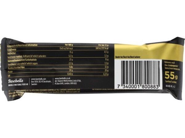 En proteinbar fra Barebells med peanuts-smag, med fokus på højt proteinindhold og uden tilsat sukker