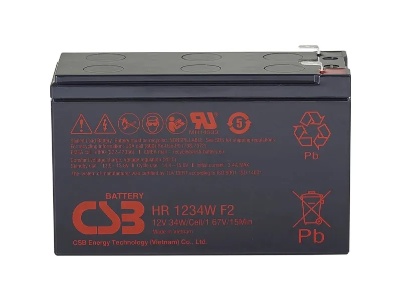 CSB HR1234WF2 är ett pålitligt UPS-batteri som är utformat för att ge tillförlitlig reservkraft i kritiska situationer. Batteriet har blysyrateknik, en utspänning på 12 V och en kapacitet på 8,5 Ah, vilket säkerställer att det uppfyller kraven i olika applikationer. Den robusta konstruktionen överensstämmer med erkända standarder som TUV, ISO 9001, ISO 14001 och UL 924, som intygar batteriets kvalitet och säkerhetsprestanda.