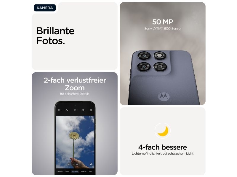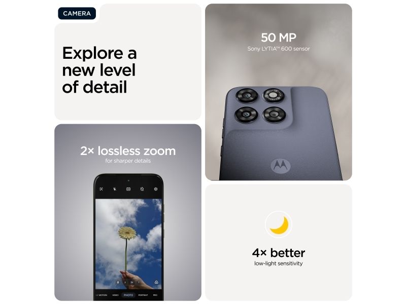 Ta fantastiska bilder med det sofistikerade kamerasystemet, som inkluderar en 50-megapixel primär bakre kamera, en 8-megapixel ultravidvinkelkamera och en mångsidig 32-megapixel framåtvänd kamera. Olika kameralägen, såsom Night Vision, Pro-läge och AI Portrait, förbättrar fotograferingsfunktionerna och hjälper användarna att släppa loss sin kreativitet. Motorola Moto G67 har också dual-SIM-funktionalitet och omfattande navigationsstöd, vilket gör den lämplig för globala användare. Med avancerade säkerhetsfunktioner och premiumdesignelement är denna smartphone skräddarsydd för att möta olika livsstilsbehov.