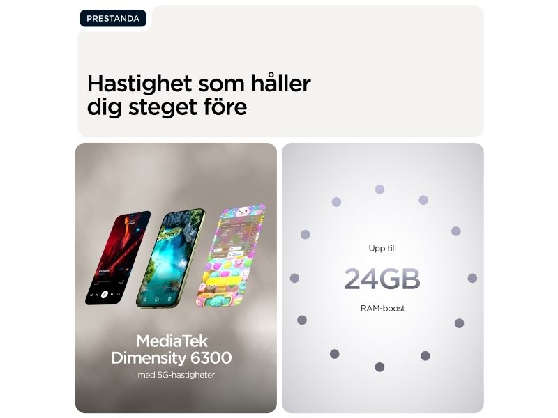 Motorola Moto G67 levererar prestanda och funktioner, vilket gör den till ett attraktivt val för dem som söker en pålitlig smartphoneupplevelse. Denna enhet drivs av MediaTek Dimensity 6300-processorn och erbjuder smidig multitasking och sömlös appfunktion. Den 6,8-tums OLED-skärmen med Extreme AMOLED-teknik garanterar levande färger och skarp bild, perfekt för strömmande video eller spel, med stöd av en uppdateringsfrekvens på 120 Hz för flytande rörelser. Utrustad med TurboPower-teknik ger batteriet på 5200 mAh förlängd användning, vilket säkerställer att användarna kan vara uppkopplade hela dagen med snabbladdningsalternativ tillgängliga.