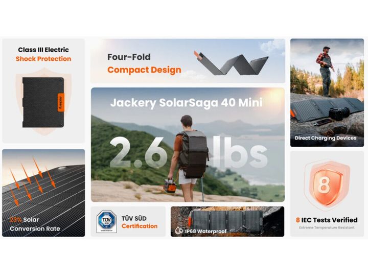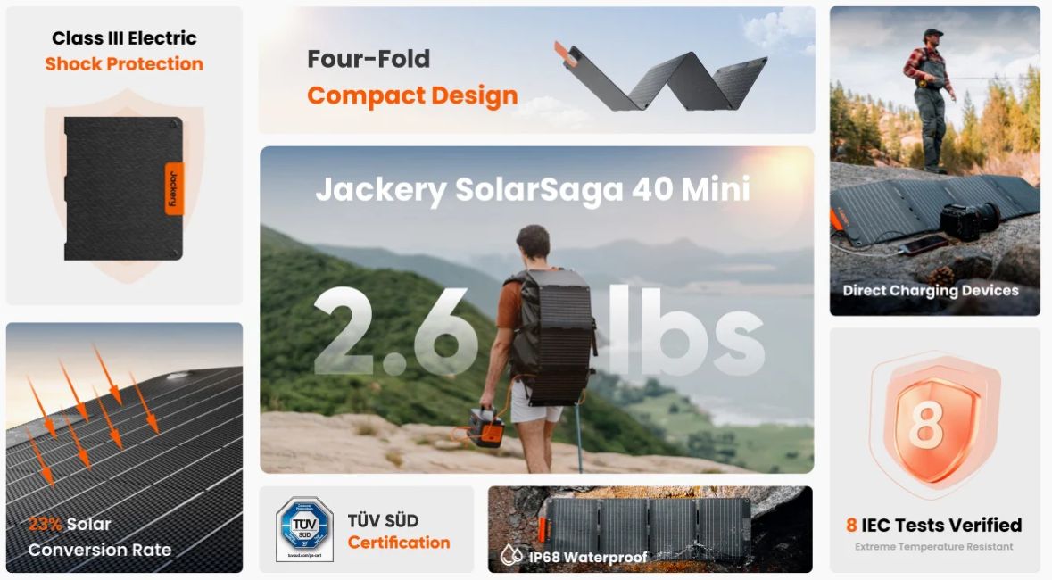 Vi presenterar Jackery SolarSaga 40 Mini solpanel, din kompakta och effektiva strömlösning för friluftsliv. Med en vikt på endast 2.6 lbs och utrustad med dubbla USB-A/C-portar är den mångsidig för olika utomhusaktiviteter såsom vandring, fiske och camping. Håll dig uppkopplad och laddad på alla dina äventyr med Jackery SolarSaga 40 Mini solpanel.