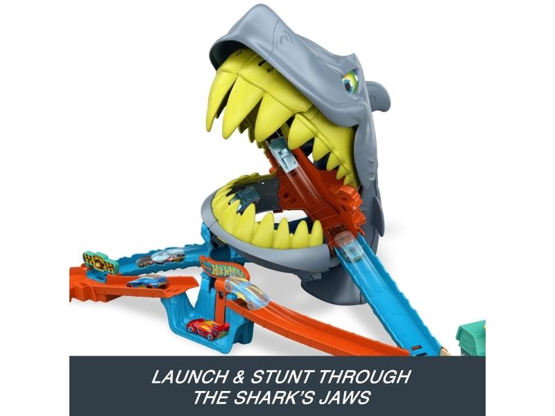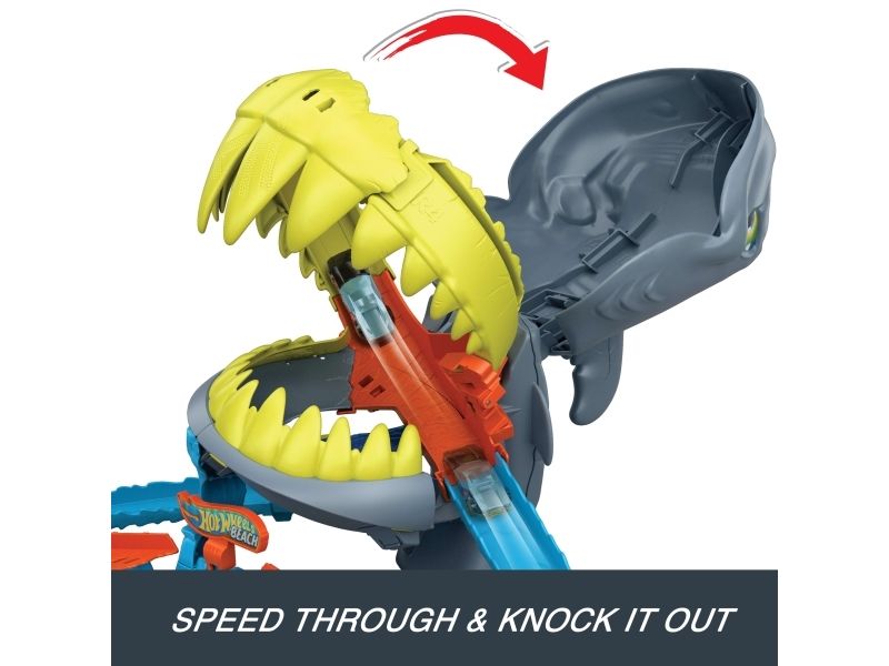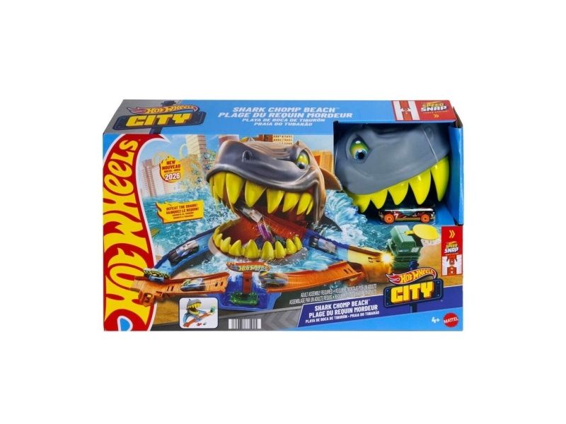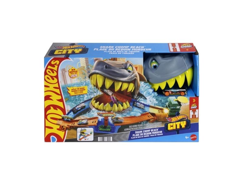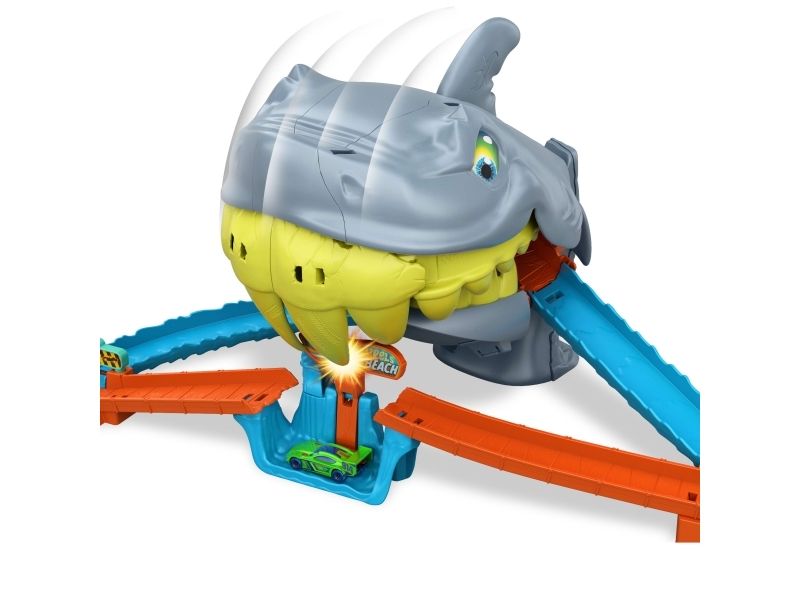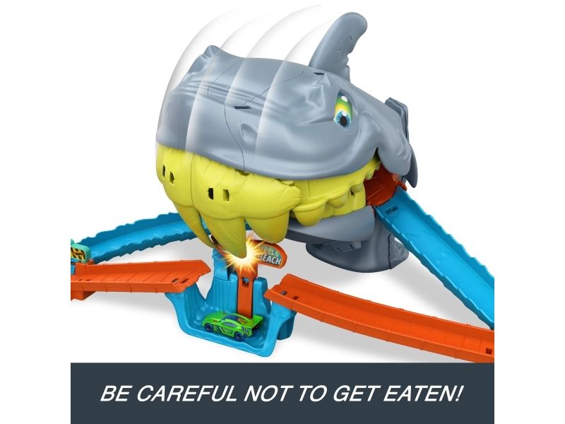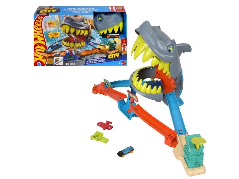 Barnen och deras Hot Wheels-leksaksbilar tar sig an en hungrig hajfiende i Hot Wheels City Shark Chomp Beach-leksetet. Justera den svängbara avfyraren för att ta en av två vägar: gör ett stunthopp över ett gap för att undvika hajen eller ta sikte direkt på den med ett stunttrick i form av en åtta. Tricket är att skjuta iväg bilen tillräckligt hårt för att komma undan oskadd och slå ut hajen. Med en enkel återställning kan barnen anta utmaningen igen. Setet innehåller Speed Snap Track System-anslutningspunkter för att fästa det på andra banor och set. (Ytterligare banor och set säljs separat.) En formgjuten Hot Wheels-bil ingår. Färger och dekorationer kan variera.