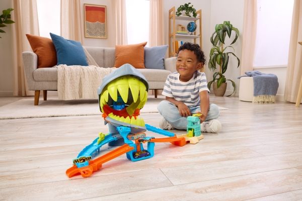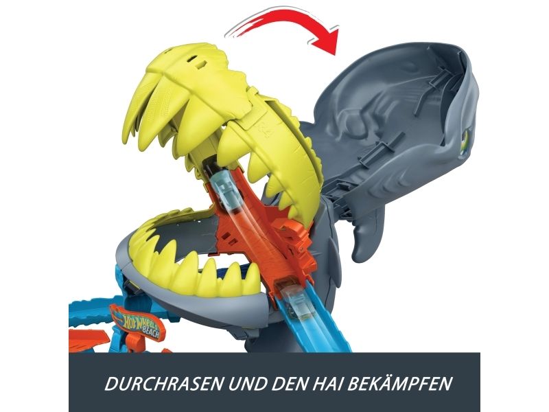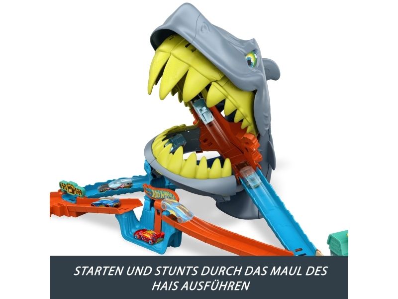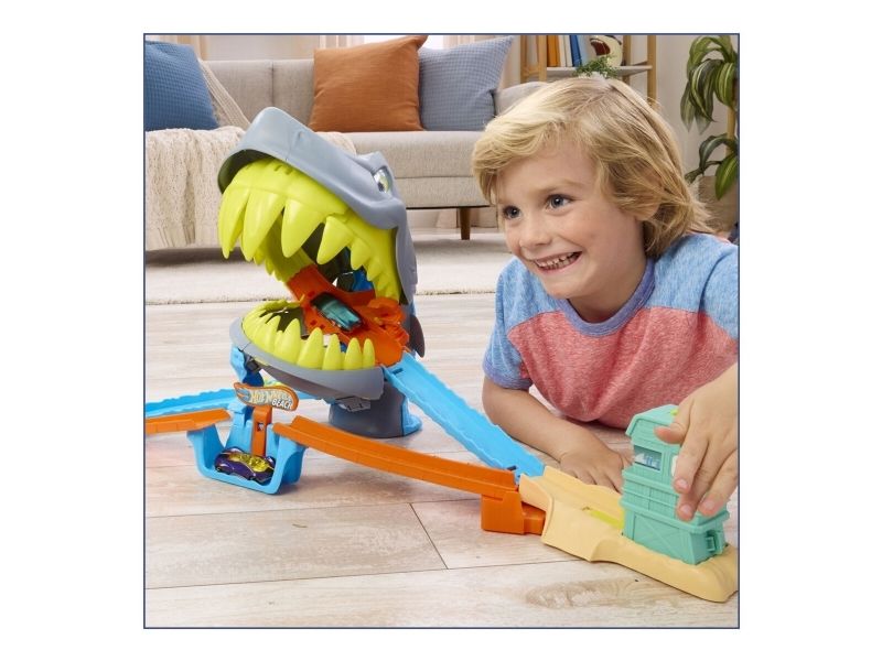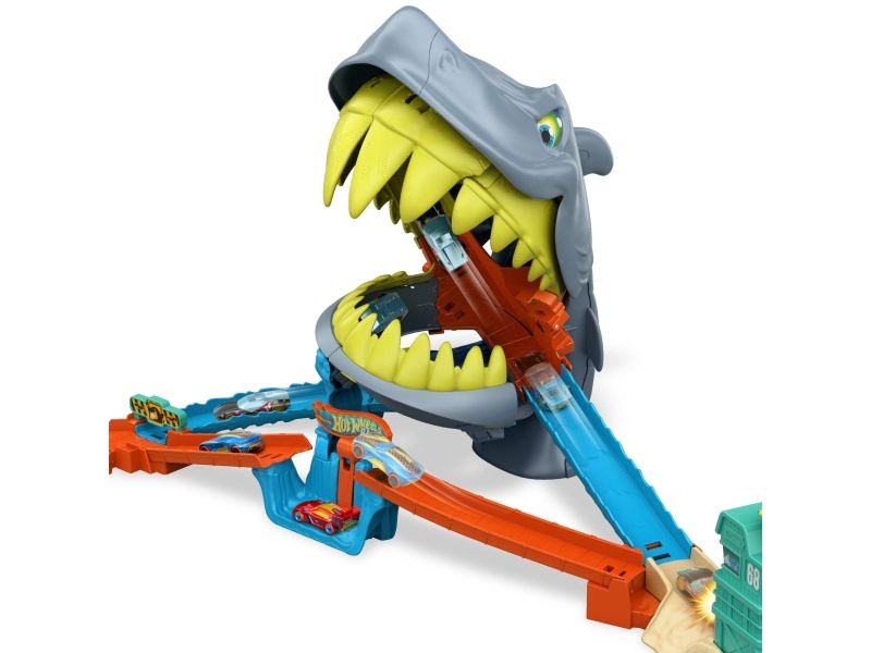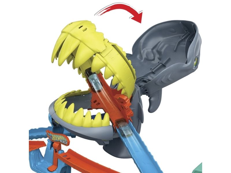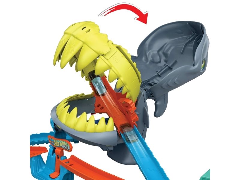 Barnen och deras Hot Wheels-leksaksbilar tar sig an en hungrig hajfiende i Hot Wheels City Shark Chomp Beach-leksetet. Justera den svängbara avfyraren för att ta en av två vägar: gör ett stunthopp över ett gap för att undvika hajen eller ta sikte direkt på den med ett stunttrick i form av en åtta. Tricket är att skjuta iväg bilen tillräckligt hårt för att komma undan oskadd och slå ut hajen. Med en enkel återställning kan barnen anta utmaningen igen. Setet innehåller Speed Snap Track System-anslutningspunkter för att fästa det på andra banor och set. (Ytterligare banor och set säljs separat.) En formgjuten Hot Wheels-bil ingår. Färger och dekorationer kan variera.