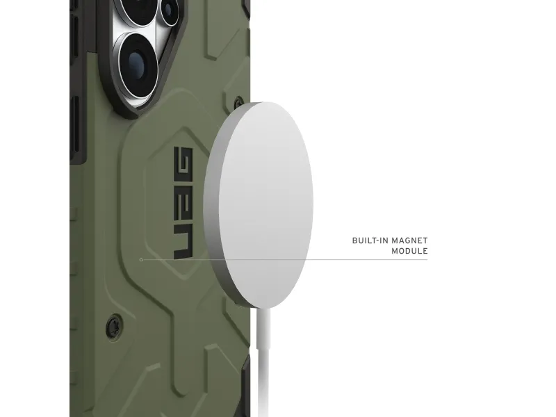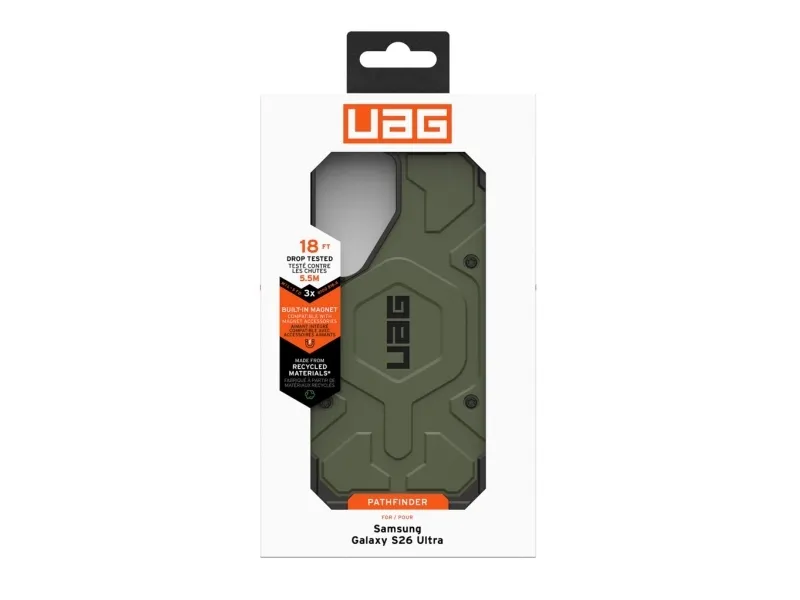 The Pathfinder Series case is built for those who do not compromise on protection. Combining an ultra-lightweight armor shell with a hex pattern impact core and reinforced TPU bumpers it delivers serious drop and shock protection without adding unnecessary bulk. Designed with an integrated magnet module raised screen surround and lanyard anchor points this is a case built to keep up with you ? wherever you go. 5.4m drop protection tested to MIL-SPEC 810G-516.6 military standards Built-in magnet module compatible with MagSafe wireless chargers and magnetic accessories Featherlight construction with impact-resistant soft core Reinforced TPU corner bumpers for enhanced shock absorption Made with up to 50% post-consumer recycled materials 5.4m Drop Protection The Pathfinder Series has been independently tested to withstand drops from up to 18 feet (5.4 meters). It meets MIL-SPEC 810G-516.6 military drop test standards ? tested three times over ? so you can trust that your Samsung Galaxy S26 is protected in even the most demanding conditions. Built-in Magnet Module The integrated magnet module holds your device securely in place during wireless charging and works seamlessly with MagSafe most wireless chargers and a wide range of magnetic accessories. Samsung Pay is fully supported so everyday use remains smooth and uninterrupted. Featherlight and Durable Despite its tough protection credentials the Pathfinder Series keeps weight to a minimum. The lightweight armor shell pairs with an impact-resistant soft core to absorb shocks without adding unnecessary thickness or weight to your device. Reinforced TPU Corner Protection. The toughest impacts tend to hit the corners first. That is why the Pathfinder Series features reinforced TPU bumpers at each corner specifically designed to absorb and disperse impact energy and protect your phone where it is most vulnerable during a drop. Made with Recycled Materials The Pathfinder Series is built with sustainability in mind. Most colorways are made with 50% post-consumer recycled (PCR) materials while the white colorway is made with 25% recycled materials. High-performance protection and responsible manufacturing together in one case. Package includes: 1x Pathfinder Series Case for Samsung Galaxy S26 Ultra - Olive Drab Product specifications: Compatible device: Samsung Galaxy S26 Ultra Drop protection: 5.4 meters (18 ft.) Drop test standard: MIL-SPEC 810G-516.6 (3x military drop test) Magnet module: Compatible with MagSafe wireless chargers and magnetic accessories Samsung Pay: Supported Corner protection: Reinforced TPU bumpers Lanyard anchor points: Integrated (lanyard not included) Recycled content: 50% post-consumer recycled materials (PCR) in most colorways; 25% in white colorway Screen surround: Raised for display protection Grip: Tactile