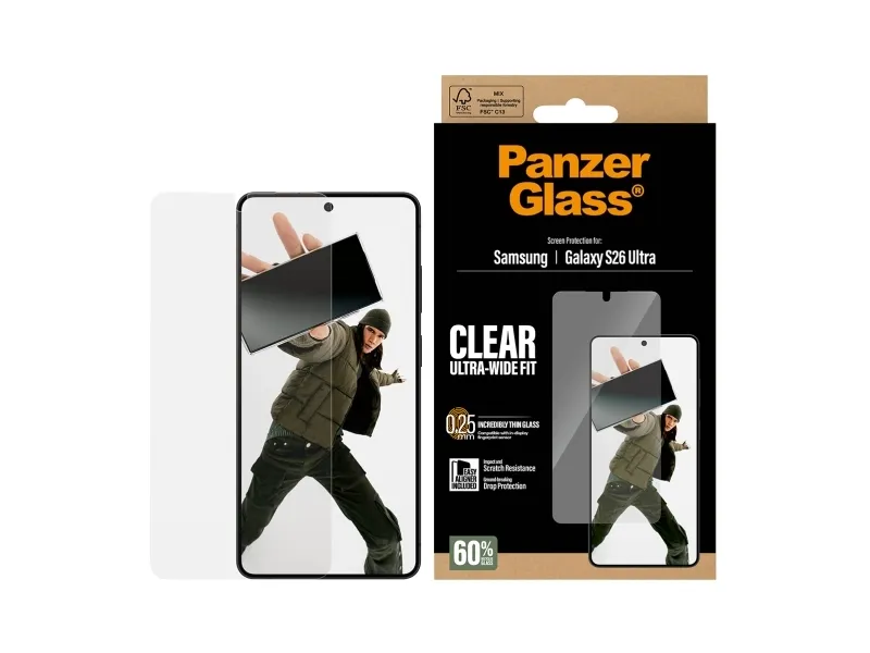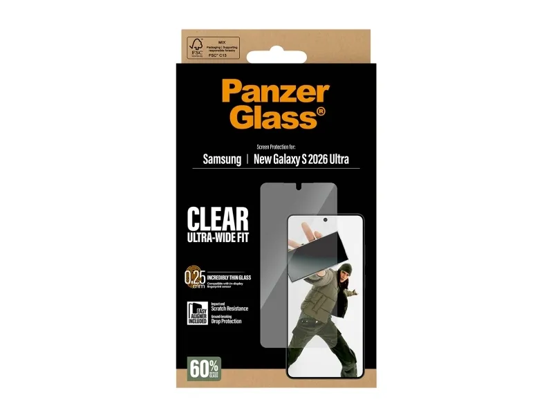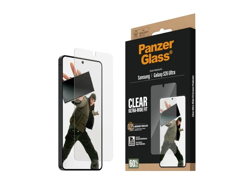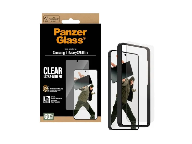 This PanzerGlass screen protector is made of 60% recycled material and provides higher scratch resistance. It even has an impressive shock-resistance capabilities and high-level drop protection, this PanzerGlass screen protector keeps your phone screen safe?from?accidental bumps against sharp-edged dangers, crushing falls onto stone-hard pavements and other hazards of everyday life. It also has a smudge-free coating that reduces traces of fingerprints and grease.Can it get any better? Maybe with the enclosed EasyAligner that makes installation a piece of cake (seriously!). And to make it even easier, we've included step-by-step instructions as well as a QR code for quick access to our online how-to video. And remember: Once the screen protection is applied, you'll never again fear the sight of your phone tumbling to the ground screen first. This may not happen, but if it does, you'll regret not having clicked "add to cart".This screen protection prolongs the lifetime of your phone so that one day you can pass it on to someone else who will love it just as much as you do. This is one way of working toward a more sustainable future. Another is to use less packaging: For this screen protector, we have managed to reduce the paper packaging by 33%* compared to previous models. So, of course, this product comes in a recyclable FSC-certified box.The screen protector is Ultra-Wide Fit, which means that it covers the front surface of your phone, providing a complete and crystal-clear view of your screen while still leaving a little room around the edges for a PanzerGlass case. If you want 360-degree phone protection, combine the screen protector and case with a PanzerGlass PicturePerfect or Hoops camera lens protector.*Measured by third-party lab by comparing the mass of the new paper packaging introduced in 2023 with the mass of the previous paper packaging introduced in 2022 (CPRTC, report No.?ZSA20231301-0016).