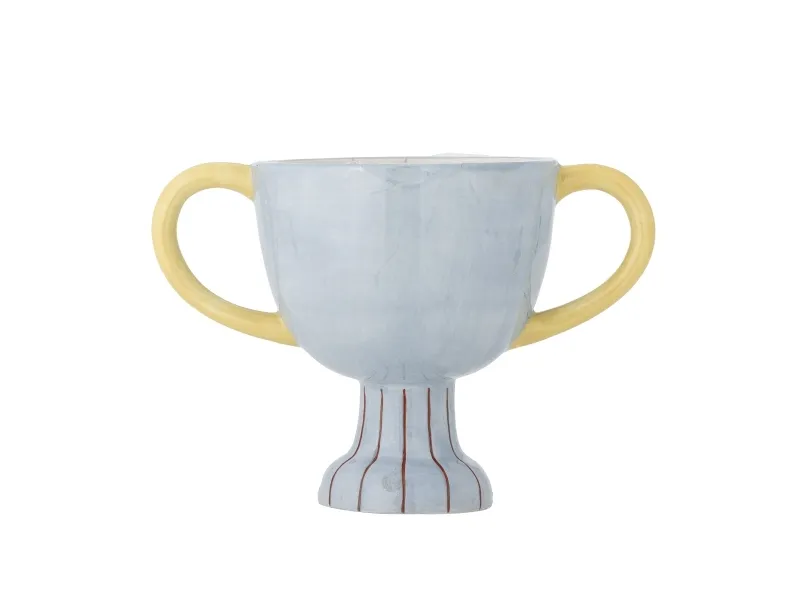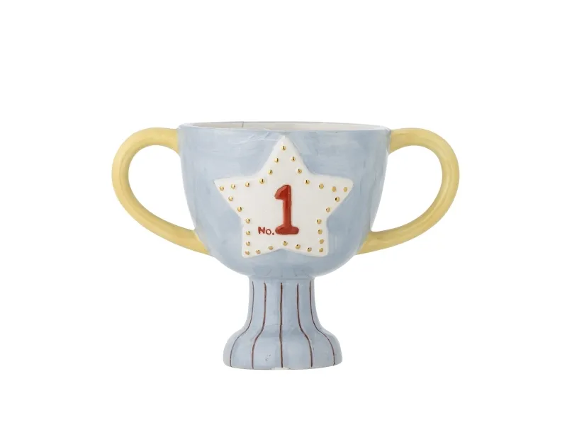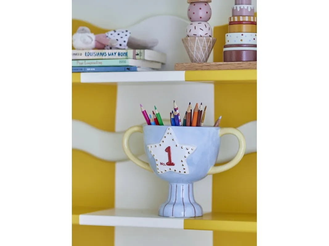 Trophy Urtepotteskjuleren fra Bloomingville MINI er lavet af keramik og formet som en pokal med to hanke. Den lyseblå skjuler har en stjerne og teksten “No. 1” – en sjov og dekorativ detalje til børneværelset.