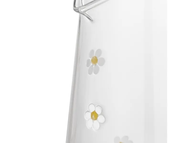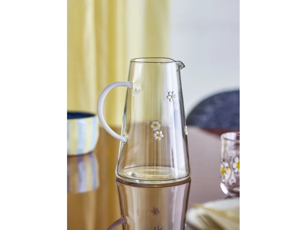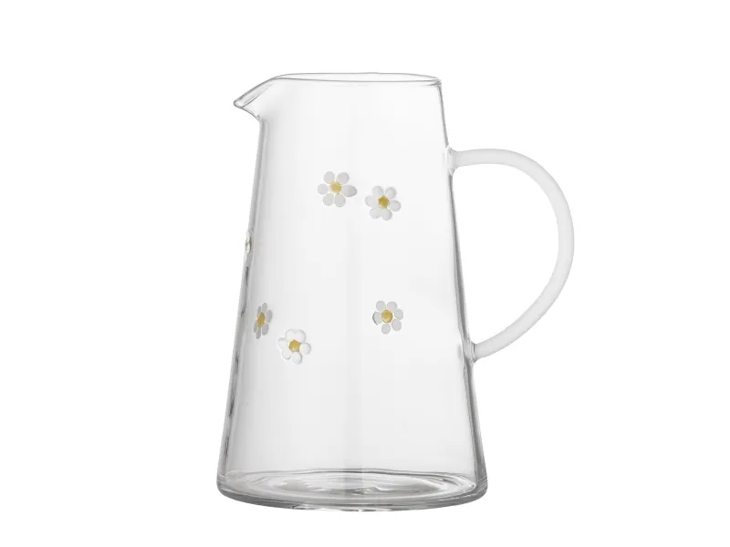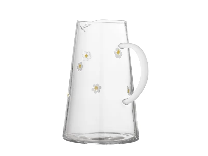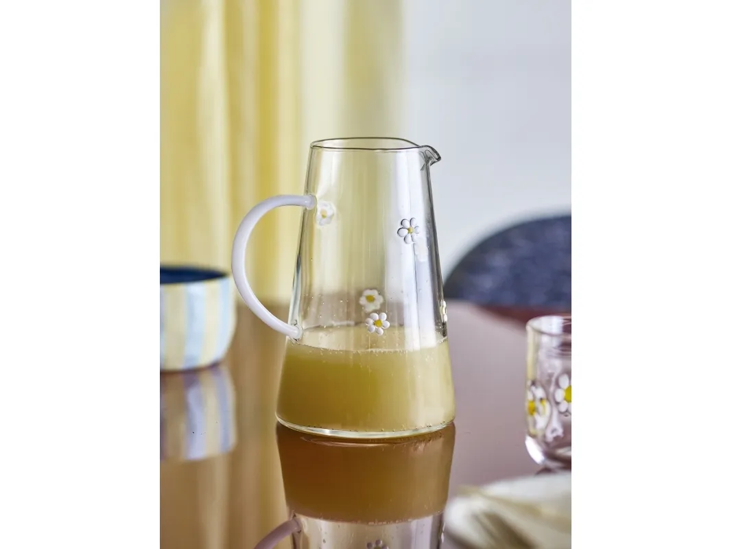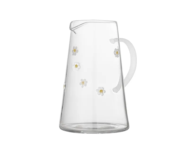 Buzz Kanden fra Bloomingville er en glaskande i gennemsigtigt glas med en bred bund, en buet hank og blomstermotiver i hvide og gule nuancer. Der kan forekomme variationer i mønster og farvestyrke, så hver kande er unik.