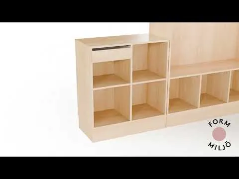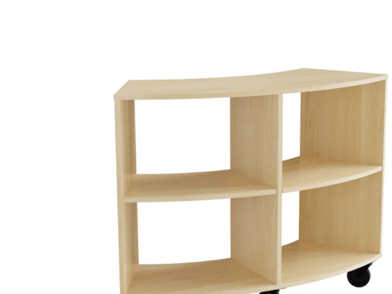 Hyllplan Stig i grå laminat 4-fack svängd 60° med hjul, förlängd rygg
