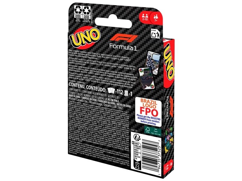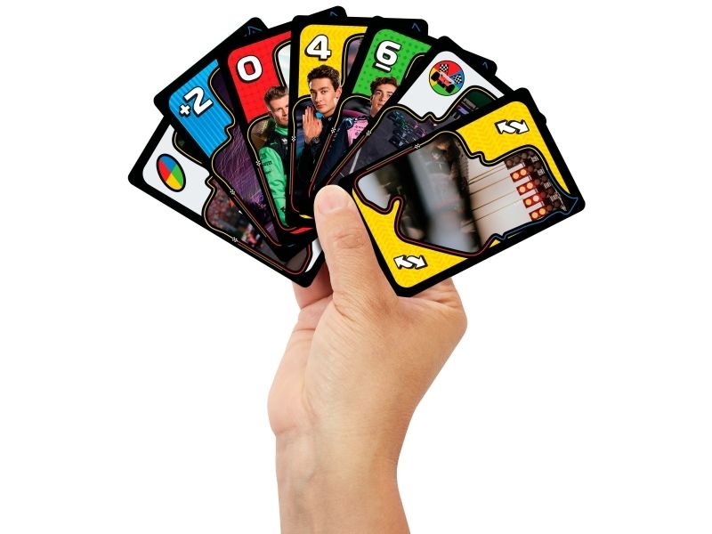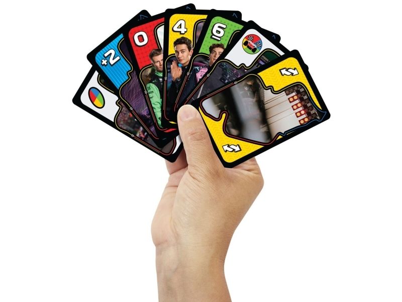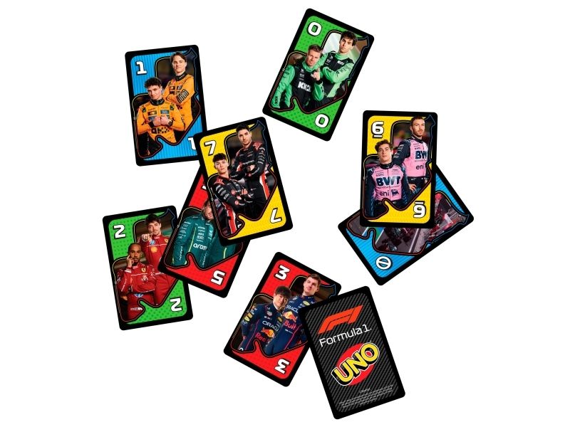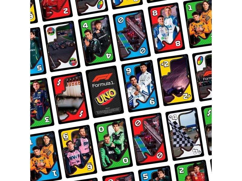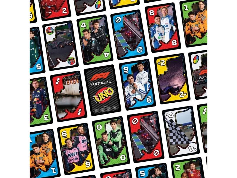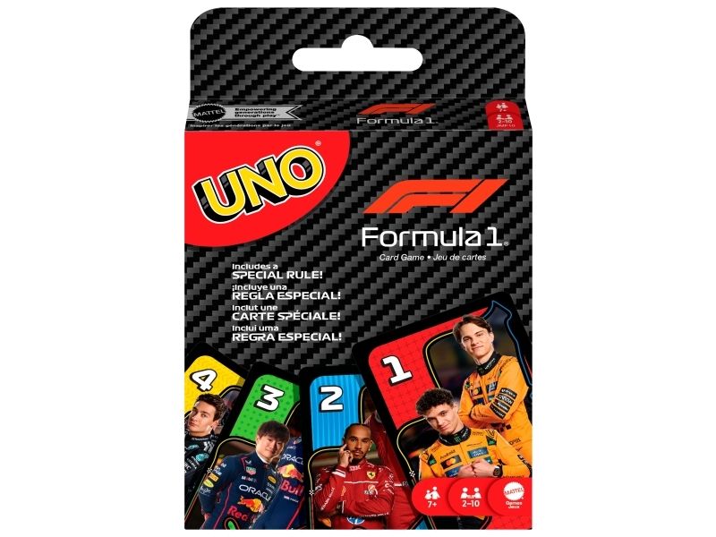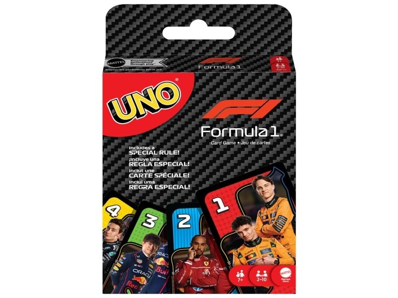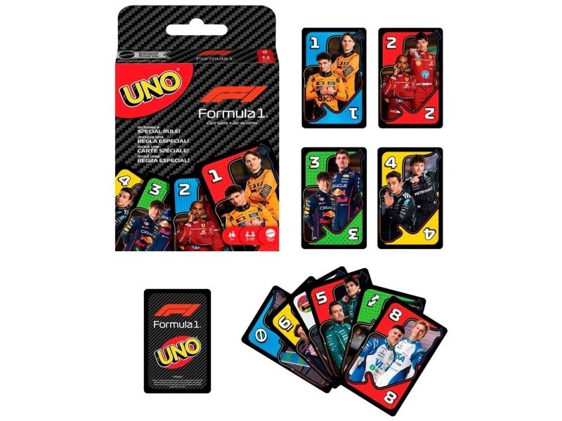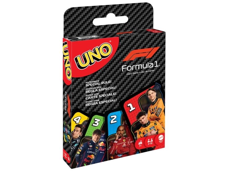 UNO- och formel 1-fansen kommer älska den här kortleken med legendariska F1-förare, som tar med farten, precisionen och den högoktaniga spänningen från banan direkt till spelarnas händer. Spelet liknar det klassiska UNO där spelarna tävlar om att matcha färger och siffror, men se upp för specialregeln ”omkörning” där det krävs ett kort av högre värde för att fortsätta leda, eller riskera att hamna efter genom att tvingas dra extra kort! Och glöm inte att växla upp och ropa ”UNO” när du bara har ett kort kvar! En fartfylld present till alla formel 1-fans och kortspelsälskare från 7 år. Färger och dekorationer kan variera.