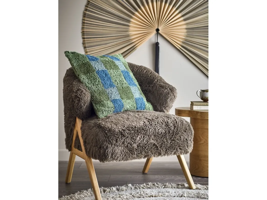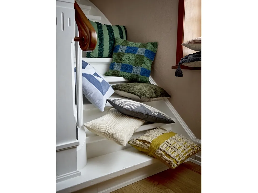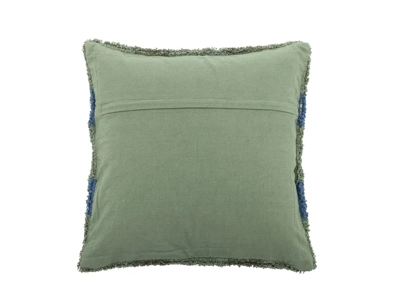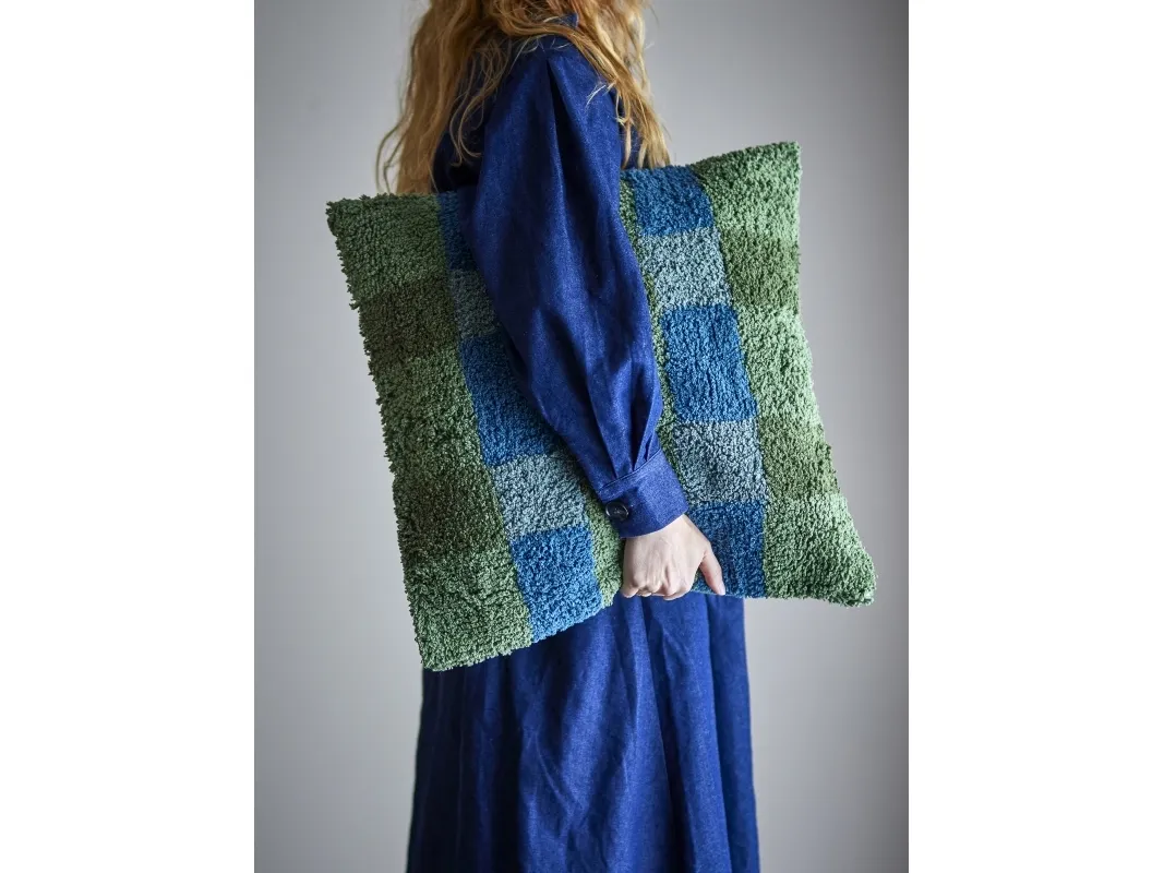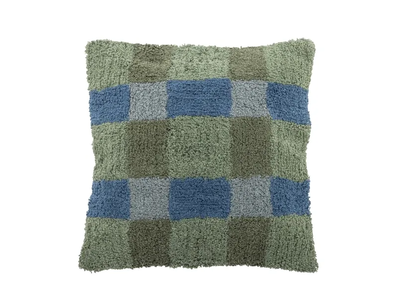 Pil Puden fra Bloomingville er en tuftet pude af bomuld og polyester med en vævet forside og en ensfarvet bagside. Den har en struktureret overflade med et ternet mønster i grønne og blå nuancer. Den fine struktur og de bløde materialer gør den til et diskret indslag i enhver indretning.