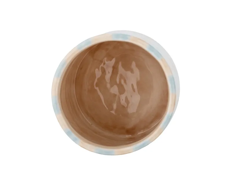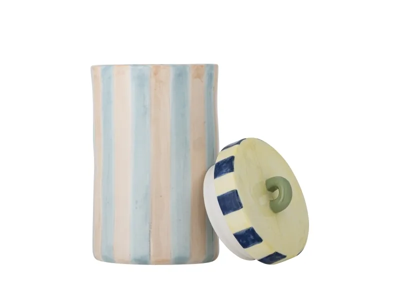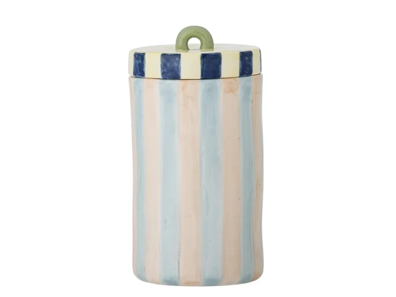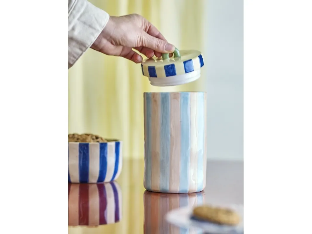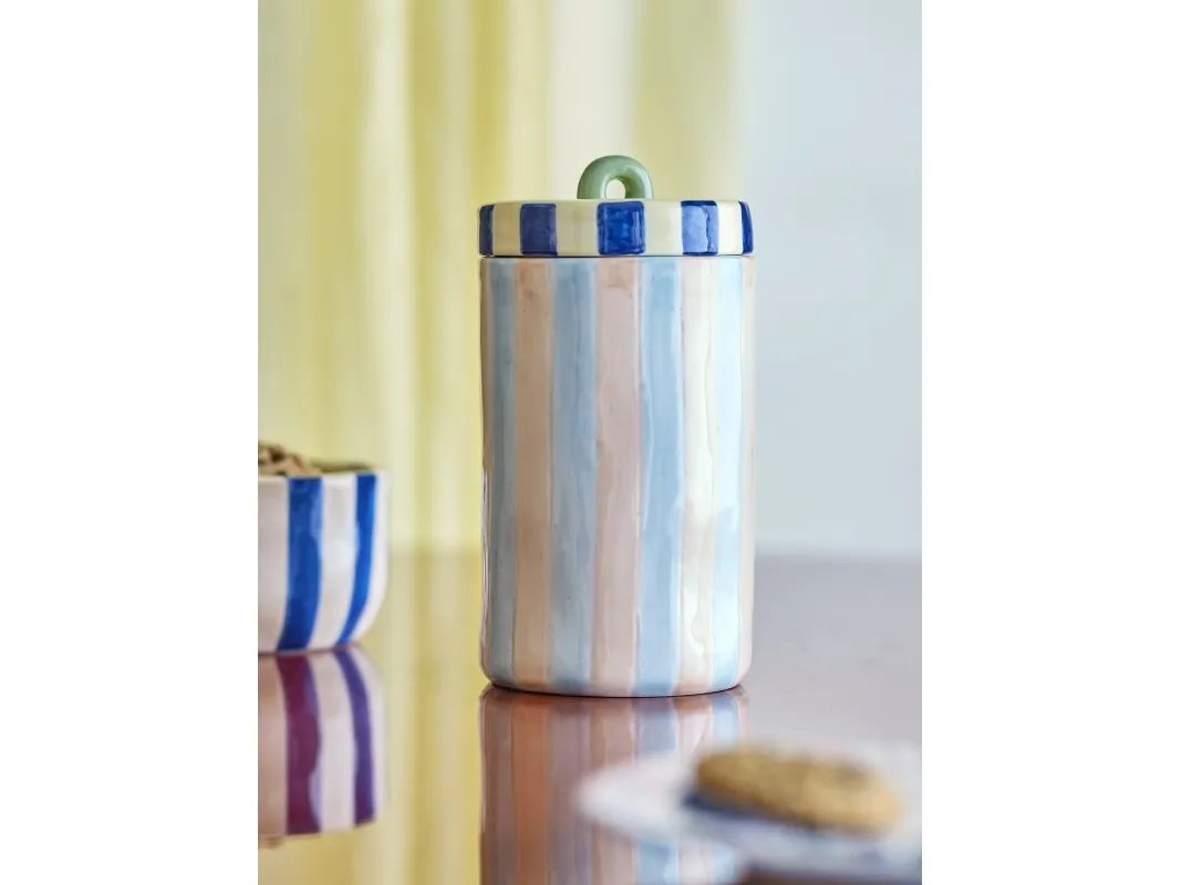 Phoenix Krukke m/låg fra Bloomingville er en krukke i stentøj med en stribet overflade og et låg i en kontrastfarve med en praktisk hank. Hver krukke er håndmalet, og der kan forekomme små forskelle i mønster og farveintensitet, hvilket gør hver enkelt unik.