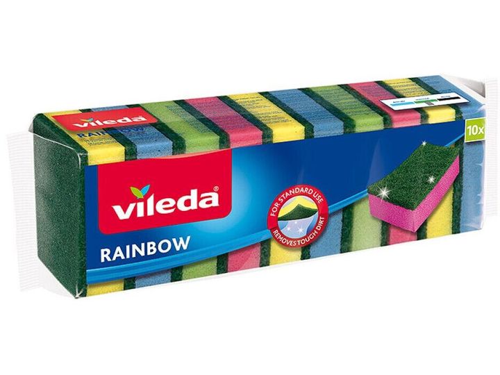 Universalrengøringssvamp fra Vileda i ekstra god kvalitet. Den grønne skureflade er meget holdbar og fnuldrer meget mindre i brug. 4 forskellige regnbuefarver, antal 10 stk.