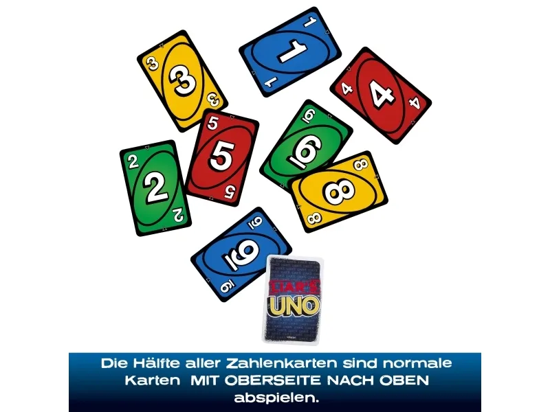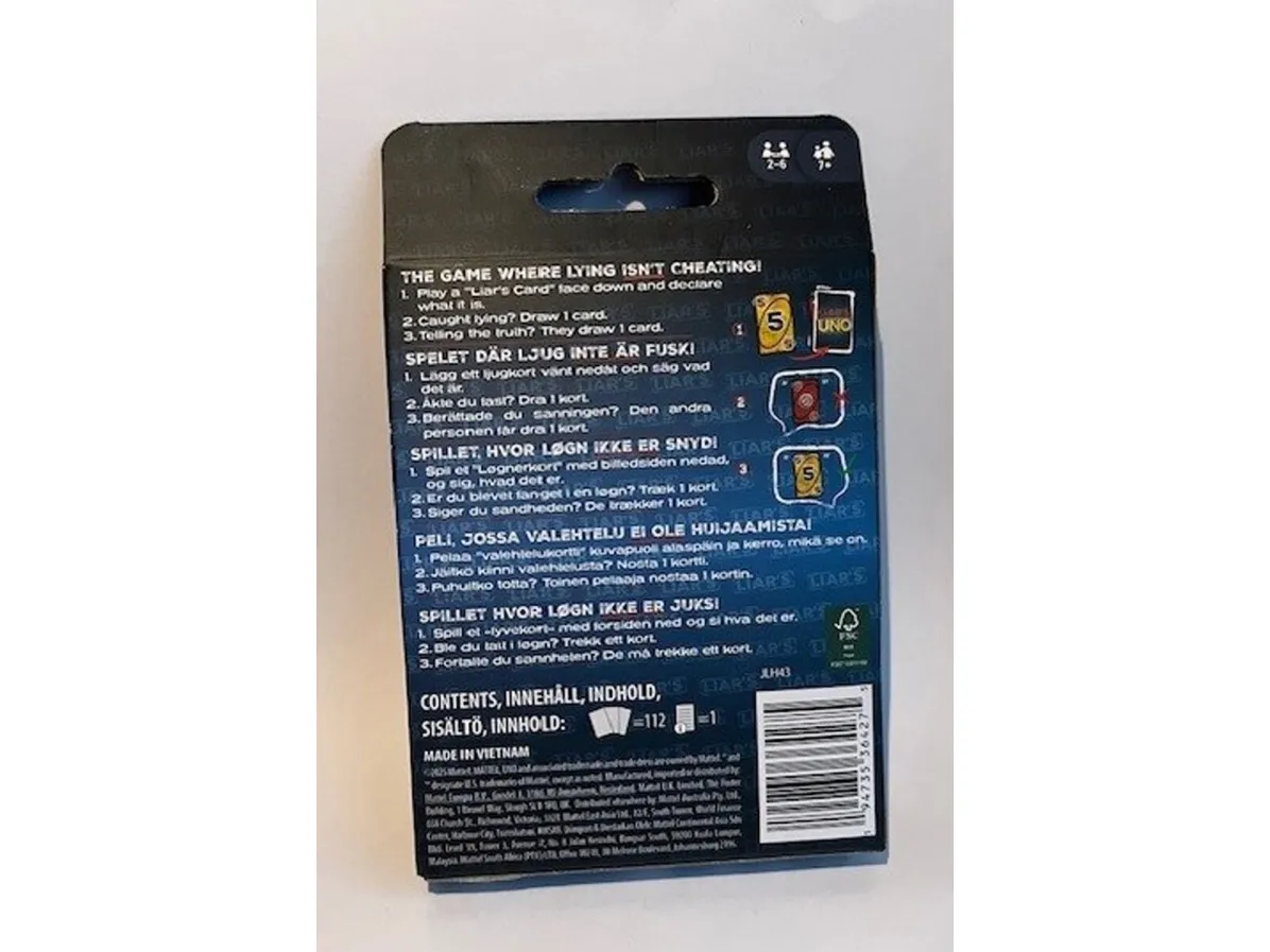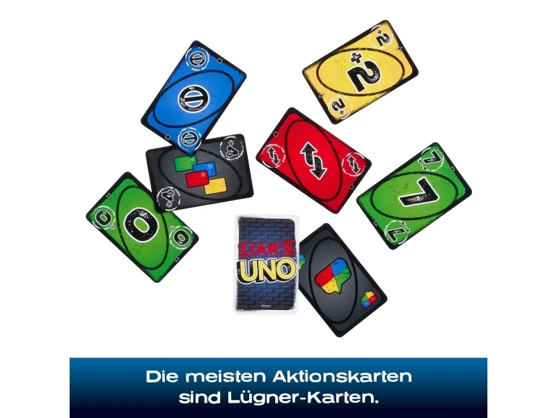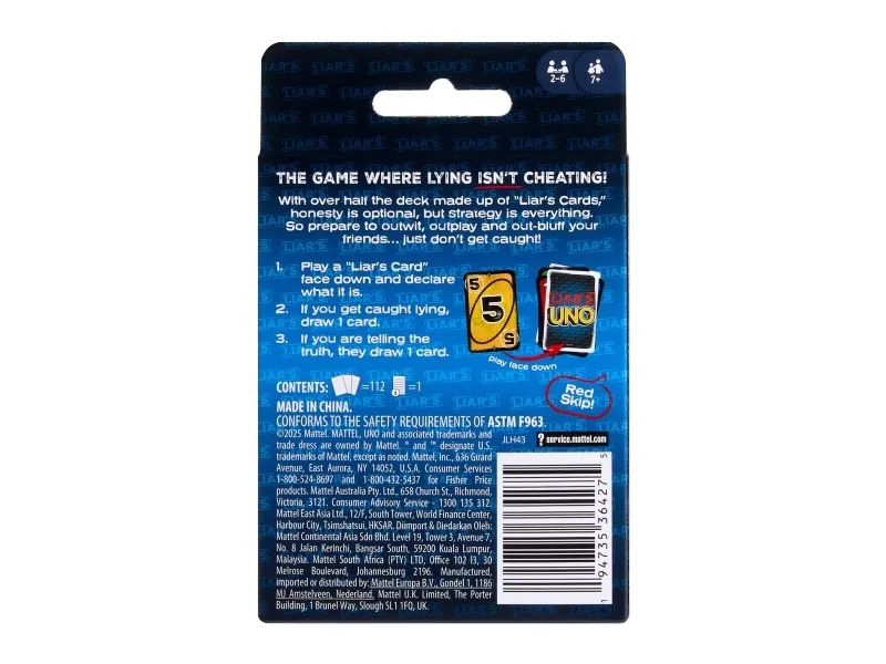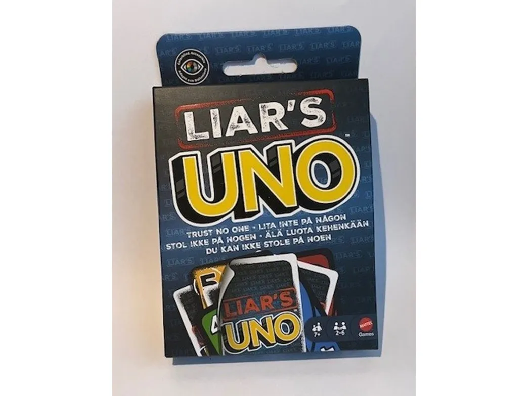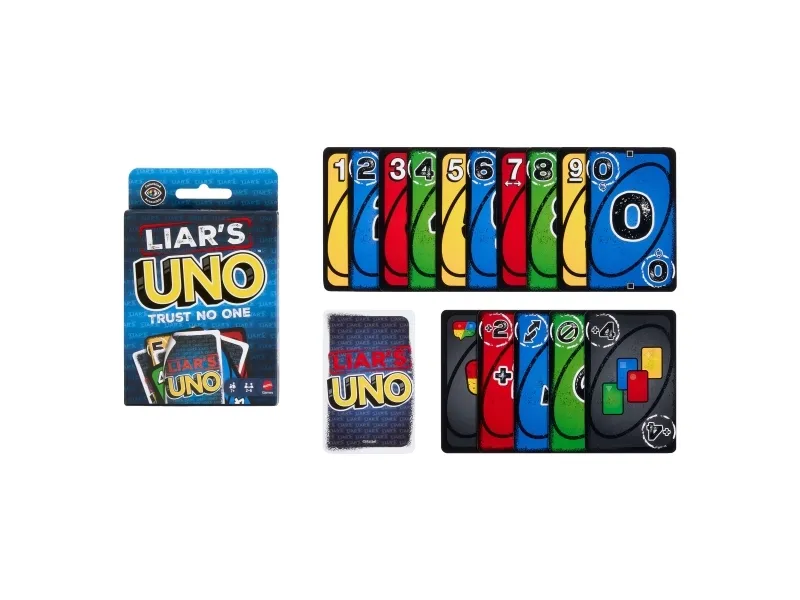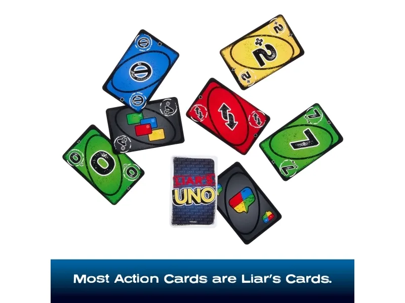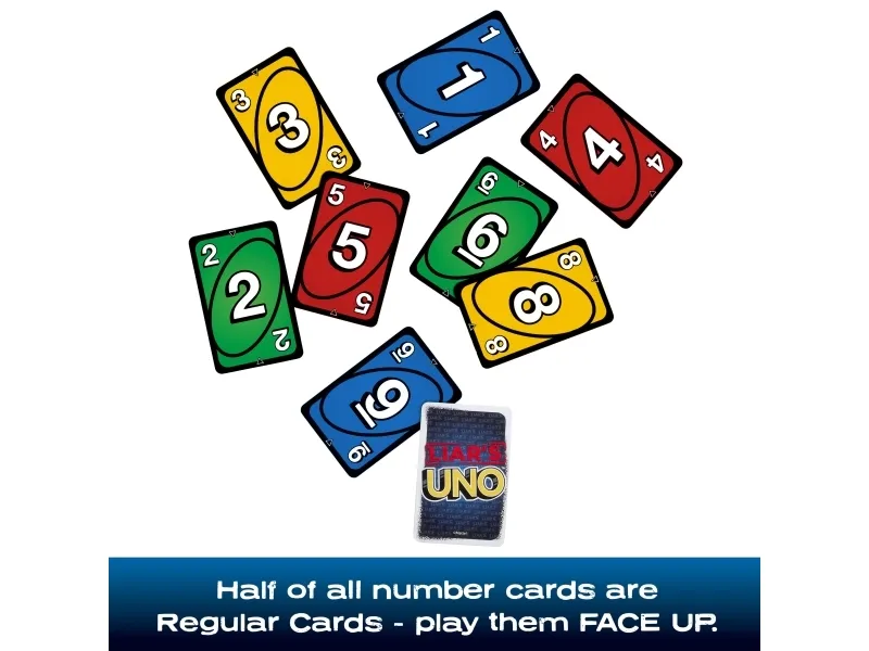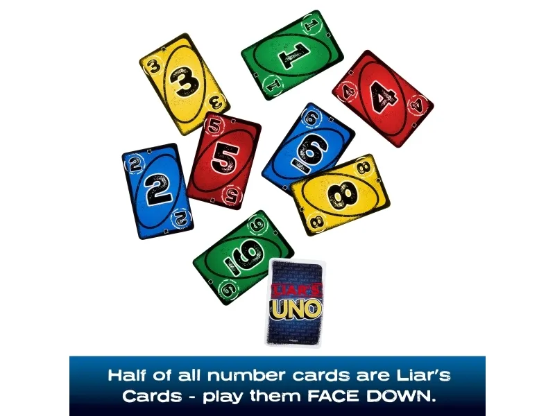 ​Fans of UNO will love this twist on the classic card game, where fibs fly and liars win! A "Liar's Card" is played FACE DOWN, and then the player announces what it is. Are they telling the truth or bluffing? If they are challenged and get caught lying, they must draw a card. But if they are telling the truth, the accuser has to draw a card. So keep a straight face, hide any tells, and, when down to one card, don't forget to shout "UNO"! Makes a great gift for card game fans 7 years old and older. Colors and decorations may vary.