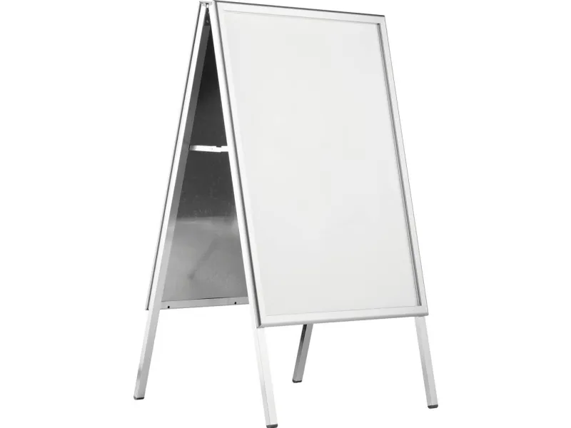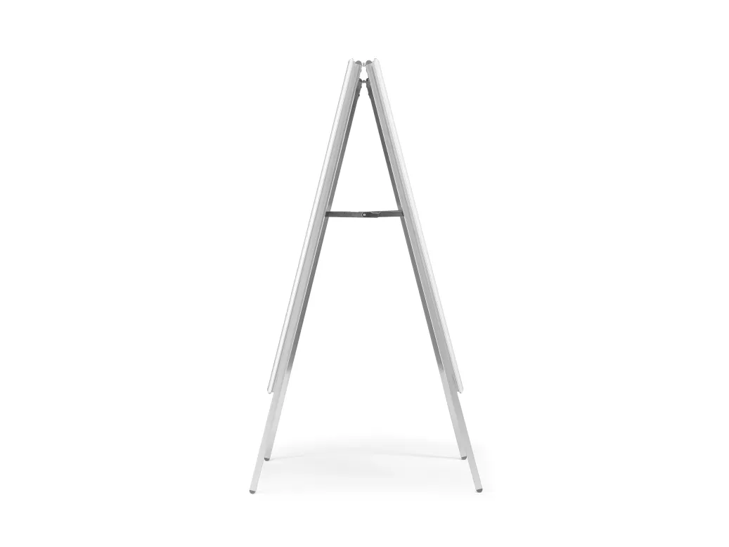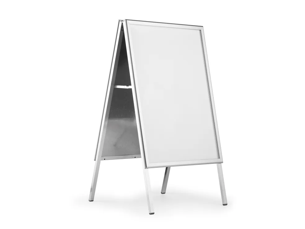 • Dobbeltsidet gadeskilt med sammenklappelig klikramme i aluminium med sølvanodiseret finish.