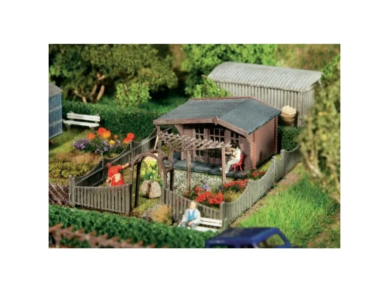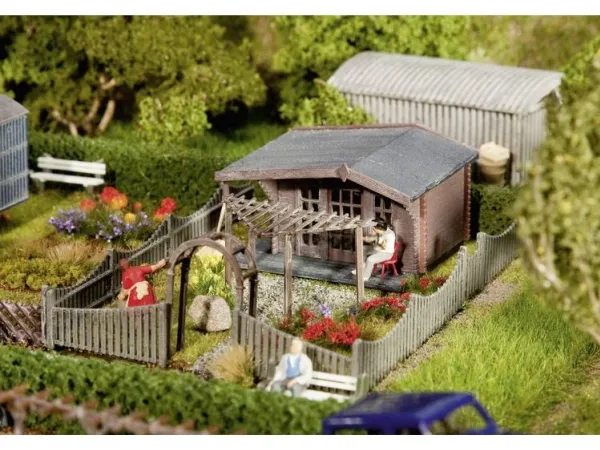 koloniträdgård som kan byggas på individuellt och kan utökas till en stor byggnad.Setet kompletteras med ett fint landskapssegment och typiska tillbehör.Byggsats från Faller.