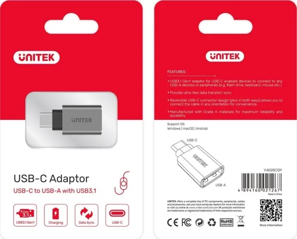 Unitek Y-A025CGY USB-C-adapter är utformad för sömlös anslutning med USB 3.1 Gen 2-överensstämmelse, vilket garanterar snabba dataöverföringshastigheter. Adaptern har en 24-polig USB-C-hankontakt i ena änden och en 9-polig USB Typ A-honkontakt i den andra, vilket ger mångsidiga anslutningsmöjligheter för en rad olika enheter. De guld- och nickelpläterade kontakterna förbättrar hållbarheten och ger en tillförlitlig lösning för anslutning av olika kringutrustning utan behov av drivrutiner tack vare Plug-and-Play-funktionen.
