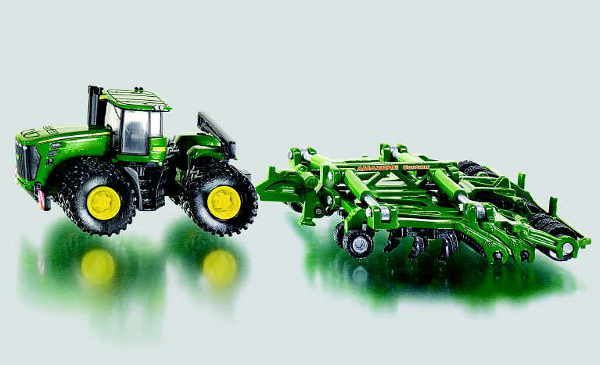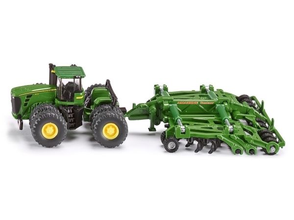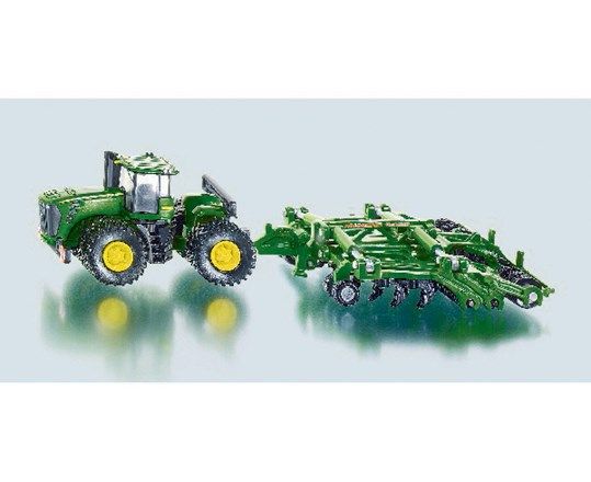 To date, the largest 1:87 scale tractor model: the powerful John Deere 9630 scraper tractor. This is a mighty model, steered by a folding axle in the middle of the machine. In combination with the powerful harrow (Amazone brand), the tractor is supplied on twin wheels. This impressive towing device to small scale is a must for every toy farm. The model combination is mainly of die-cast metal. Both harrow elements of the Amazone Centaur can be folded away for safe road transport.