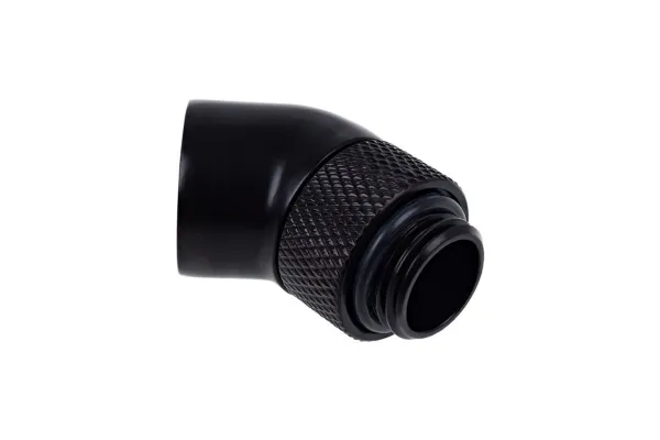 This adapter has a rotatable ¼" external screw thread on one side and a ¼" internal thread on the other side. This 45° angle connector is mostly useful in cases where ¼" threads are too close to one another and larger hose connections do not fit next to each other.