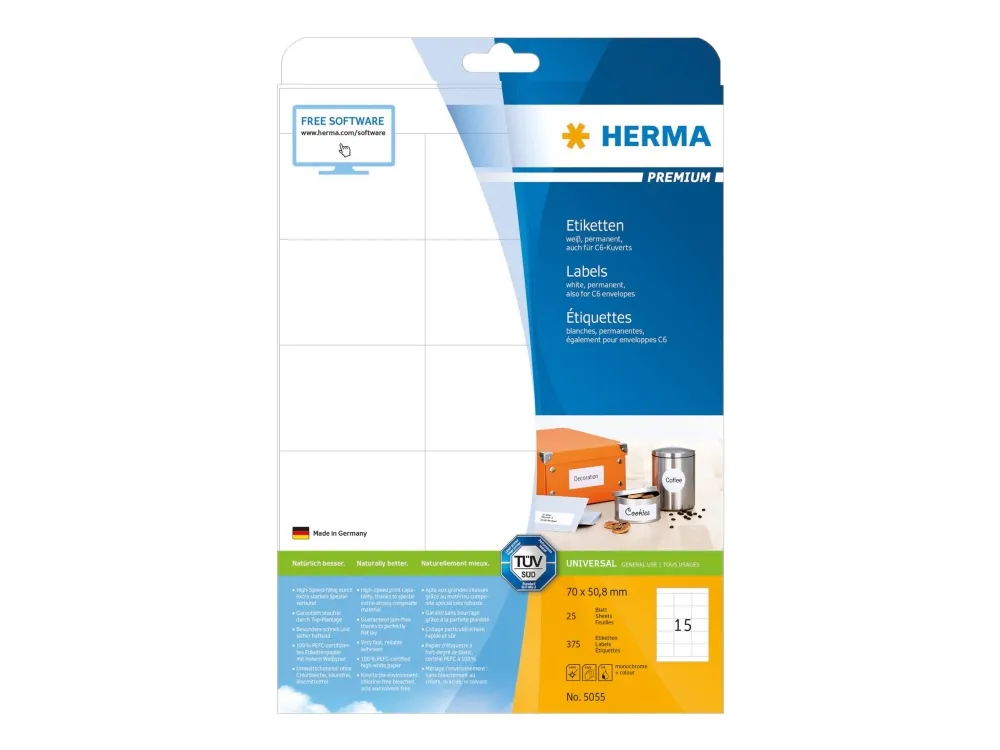 HERMA Premium laminerade etiketter erbjuder kvalitet och mångsidighet för olika märkningsbehov. Med en storlek på A4 (210 x 297 mm) och 15 etiketter per ark är dessa etiketter lämpliga för utskrift med både bläckstråleskrivare och laserteknik. Den matta ytfinishen förbättrar läsbarheten medan det permanenta självhäftande materialet säkerställer att etiketterna fäster säkert på ytor. Etiketterna uppfyller ISO 9001:2008-standarderna och är effektiva och miljövänliga eftersom de är klorfria och tillverkade av 100 % återvunnet papper.
