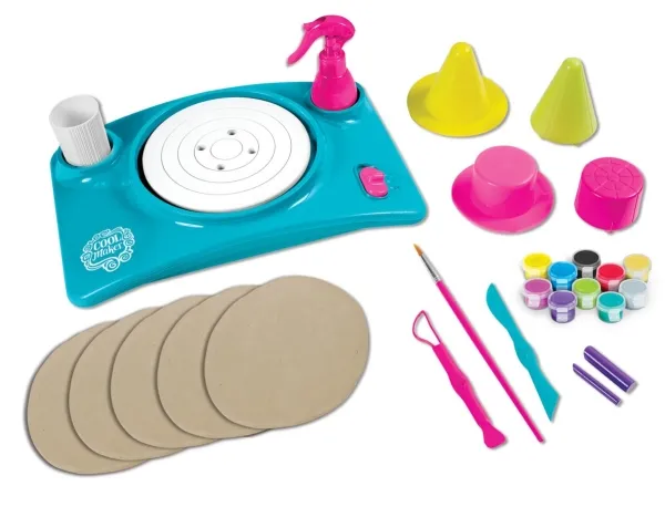 Pottery Cool is the new way to create with clay! Shape the clay discs onto the pottery wheel, and let it spin while you mold your design. Make it cool by customizing your pottery with the sculpting tools. Let your clay design air dry, and then paint it with the awesome included paints. The Pottery Cool Studio allows you to craft 6 clay projects or get creative and sculpt your own designs. Turn pottery upside down with Pottery Cool!