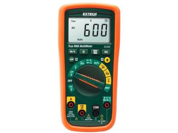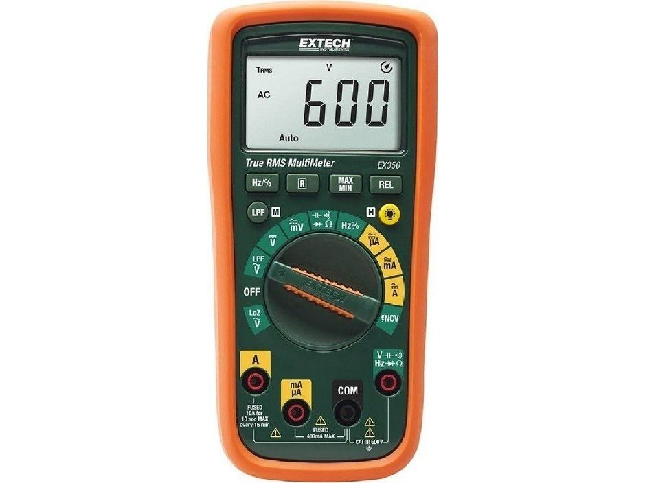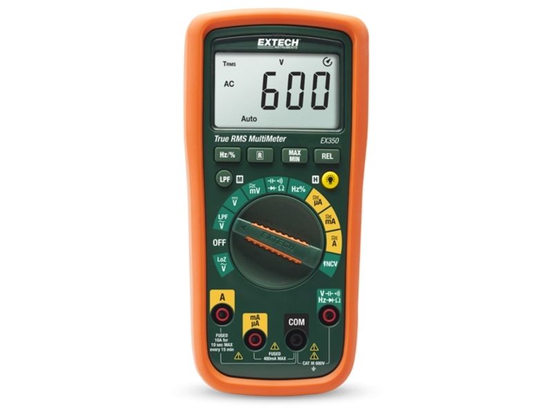 Digital-multimeter EX350Stort LC-display med baggrundsbelysning Måling af spændinger med variabel frekvens (LPF) Den Lo Z-tilstand beskytter måleværdier mod strø- og fantomspænding Automatisk og manuelt valg af måleområde 0,5 % DCV-nøjagtighed Auto-sluk (APO) med mulighed for deaktivering 10 A AC/DC-målinger Kontaktfrie AC-spændingdetektor Visuel og akustisk alarm ved forbindelsesmålinger Visning af batteriskiftDigitalt sand RMS multimeter med mange måle- og ekstra funktioner. Udover fjernbetjeningens standardkontrolknapper til DMM-funktioner er en lav impedans tilstand (Lo-Z), samt en en displaybelysning, berøringsfri AC-spændingstester medfølger.