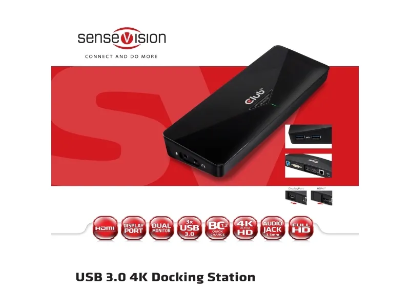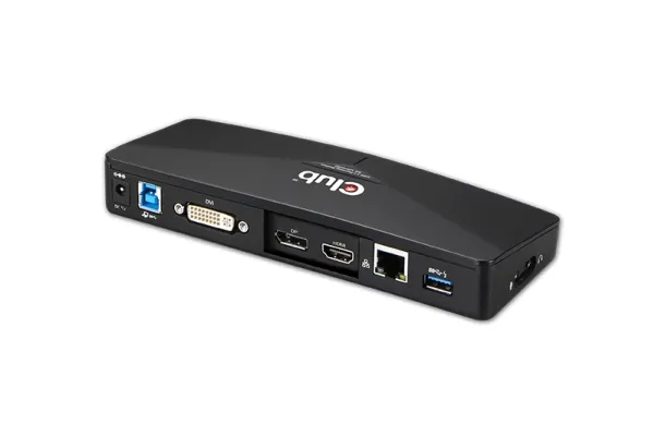 CLUB 3D versatile USB 3.0 4K Docking Station is designed for extra connectivity demands. With the docking station, you can extend the connection of a computer to more USB peripherals, Ethernet network, the speaker and the microphone through one single USB cable. With the built-in USB 3.0 ports, the docking station enables you to enjoy the super speed data transmission between USB peripherals. In addition to this, the docking station is equipped with video output supporting the 4K standard on HDMI and DP ports.